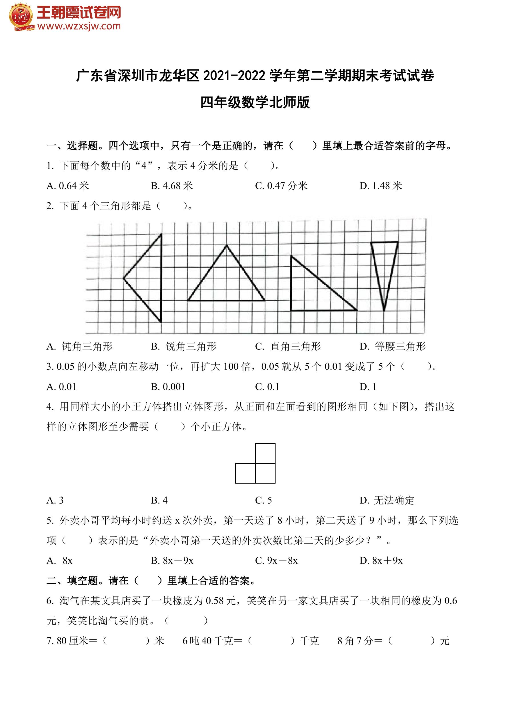 广东省深圳市龙华区2021-2022学年第二学期期末考试试卷四年级数学(北师版)