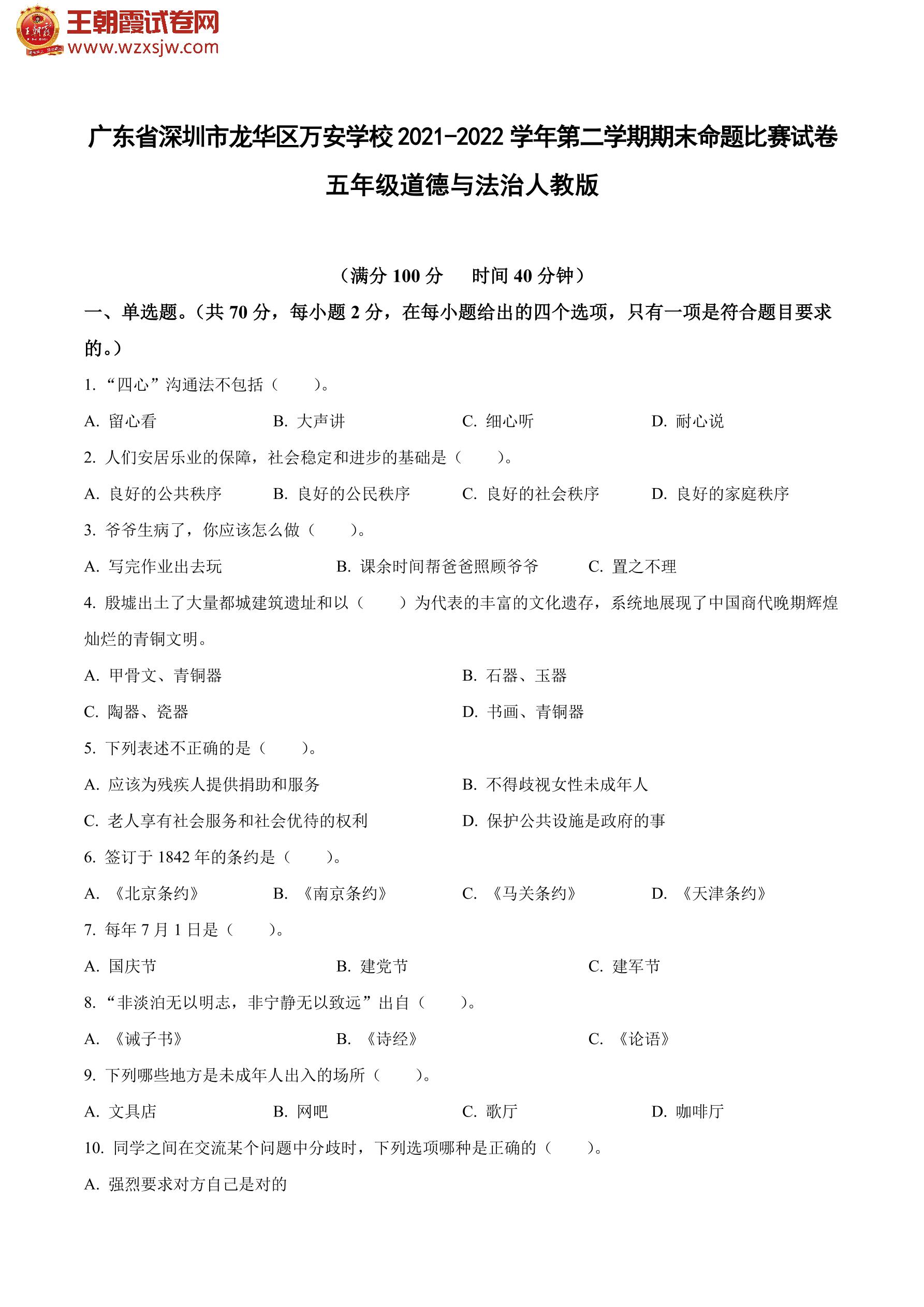 广东省深圳市龙华区万安学校2021-2022学年第二学期期末命题比赛试卷五年级道德与法治(人教版)