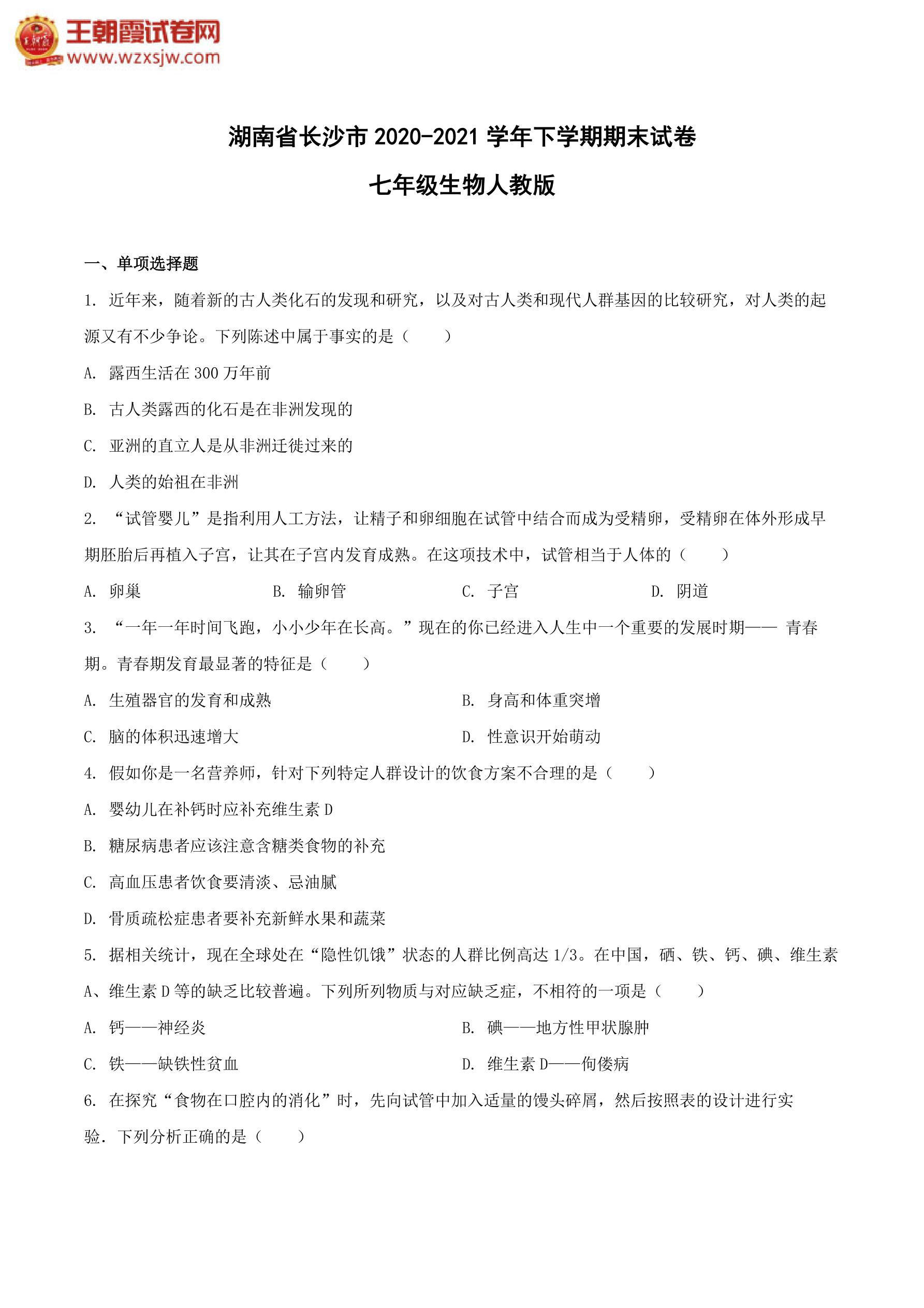 湖南省长沙市2020-2021学年下学期期末试卷七年级生物(人教版)
