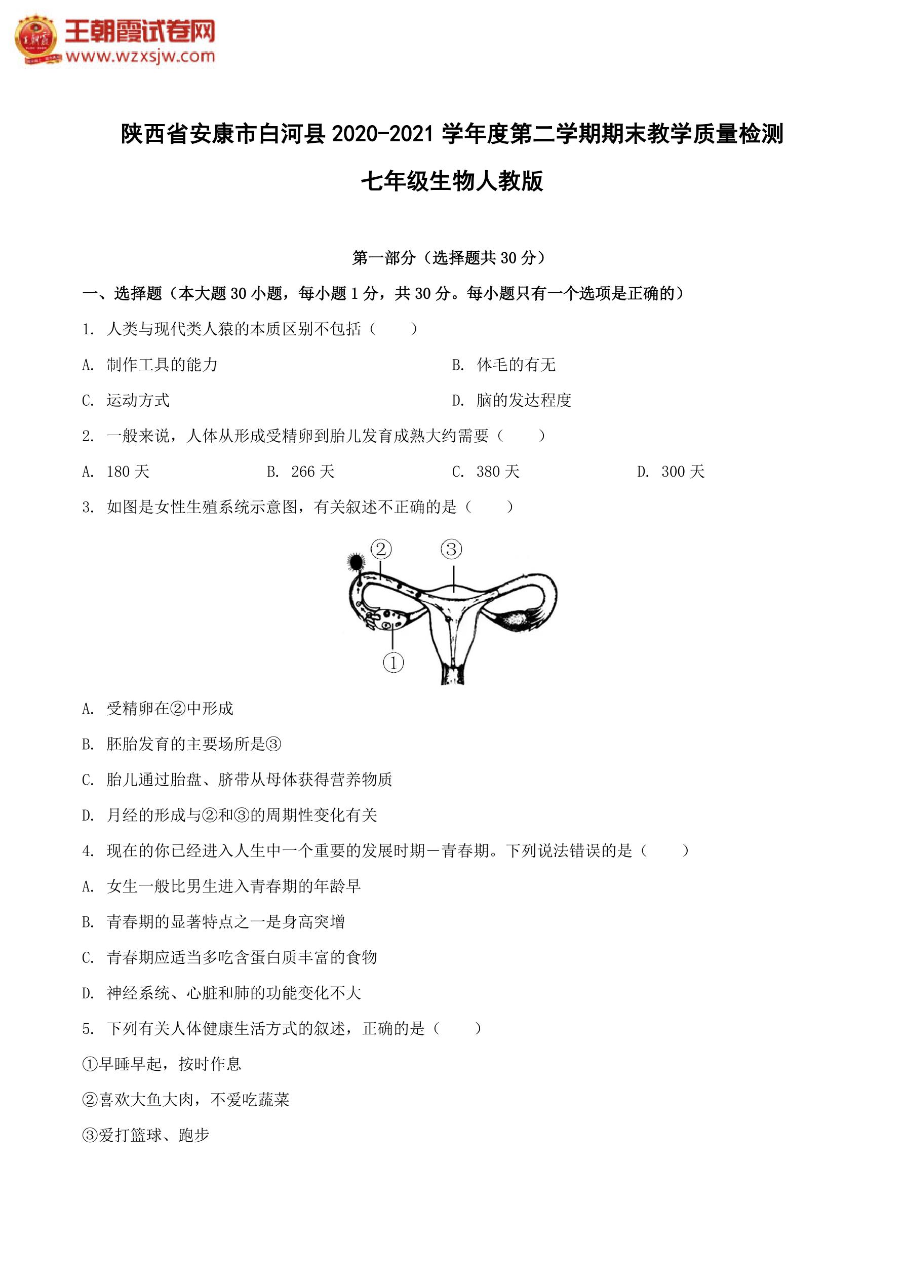 陕西省安康市白河县2020-2021学年度第二学期期末教学质量检测七年级生物(人教版)
