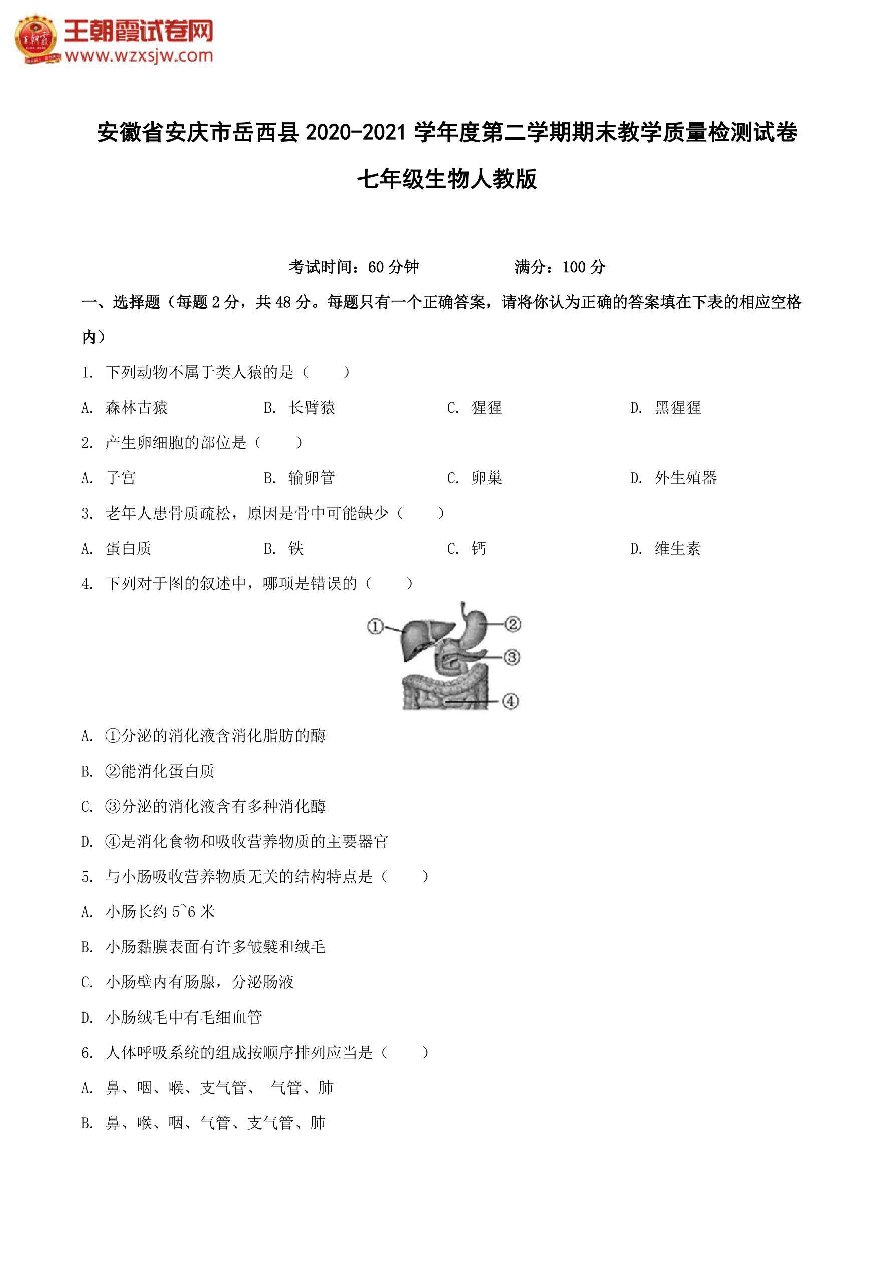 安徽省安庆市岳西县2020-2021学年度第二学期期末教学质量检测试卷七年级生物(人教版)