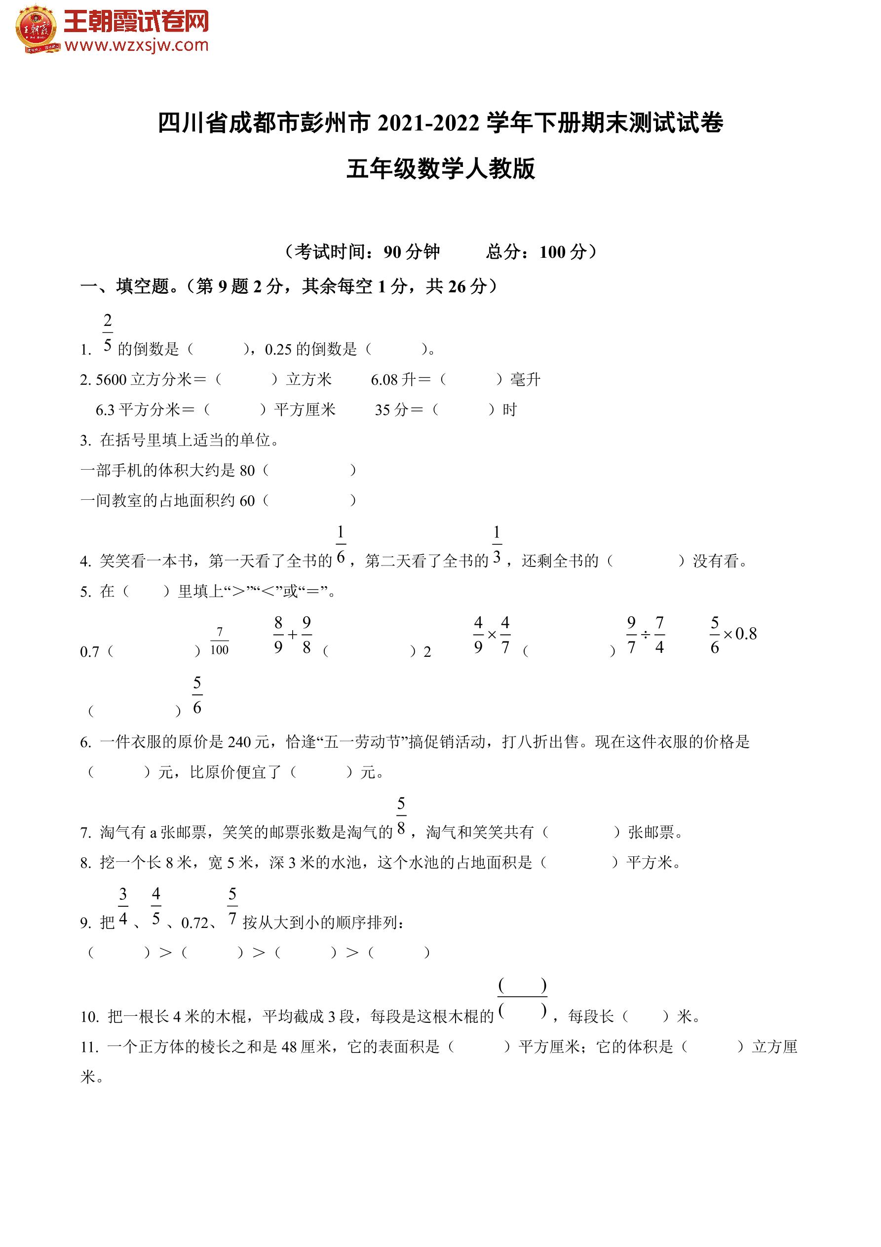 四川省成都市彭州市2021-2022学年下册期末测试试卷五年级数学(人教版)