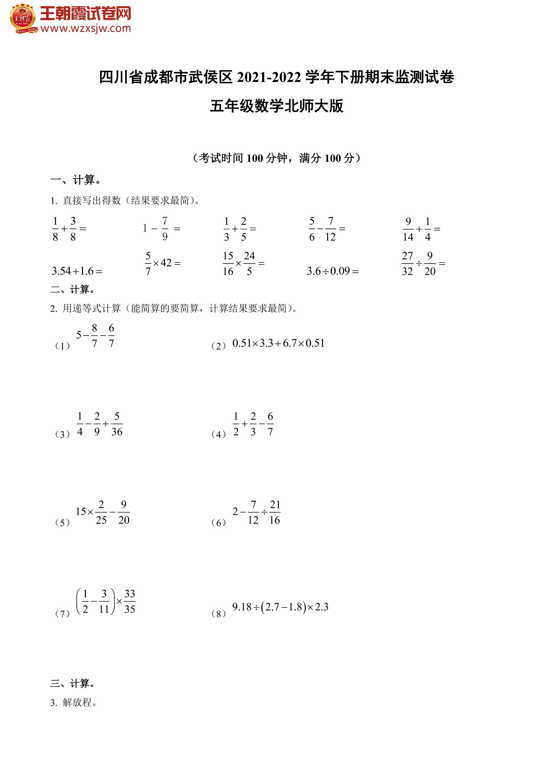 四川省成都市武侯区2021-2022学年下册期末监测试卷五年级数学(北师版)