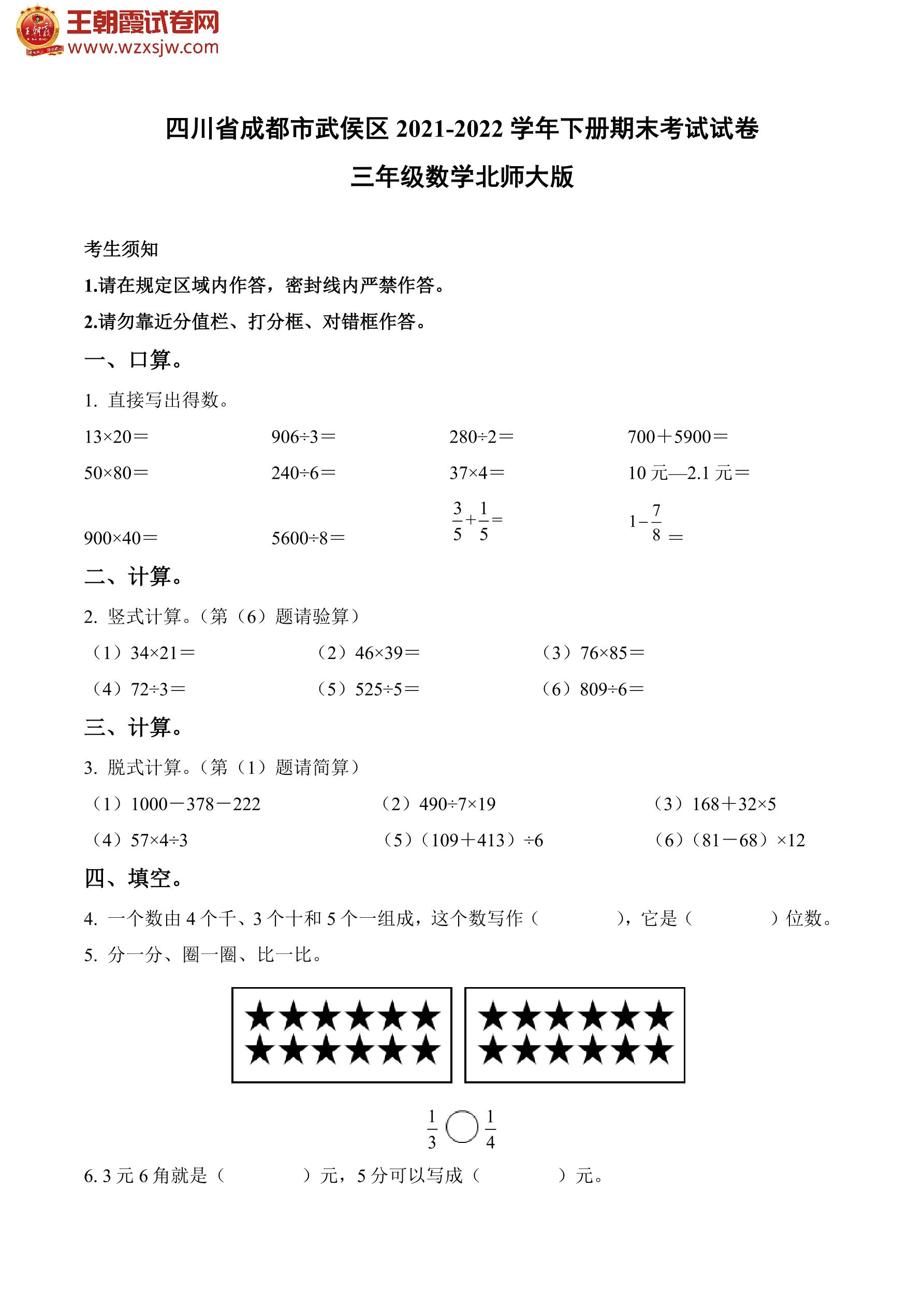 四川省成都市武侯区2021-2022学年下册期末考试试卷三年级数学(北师版)