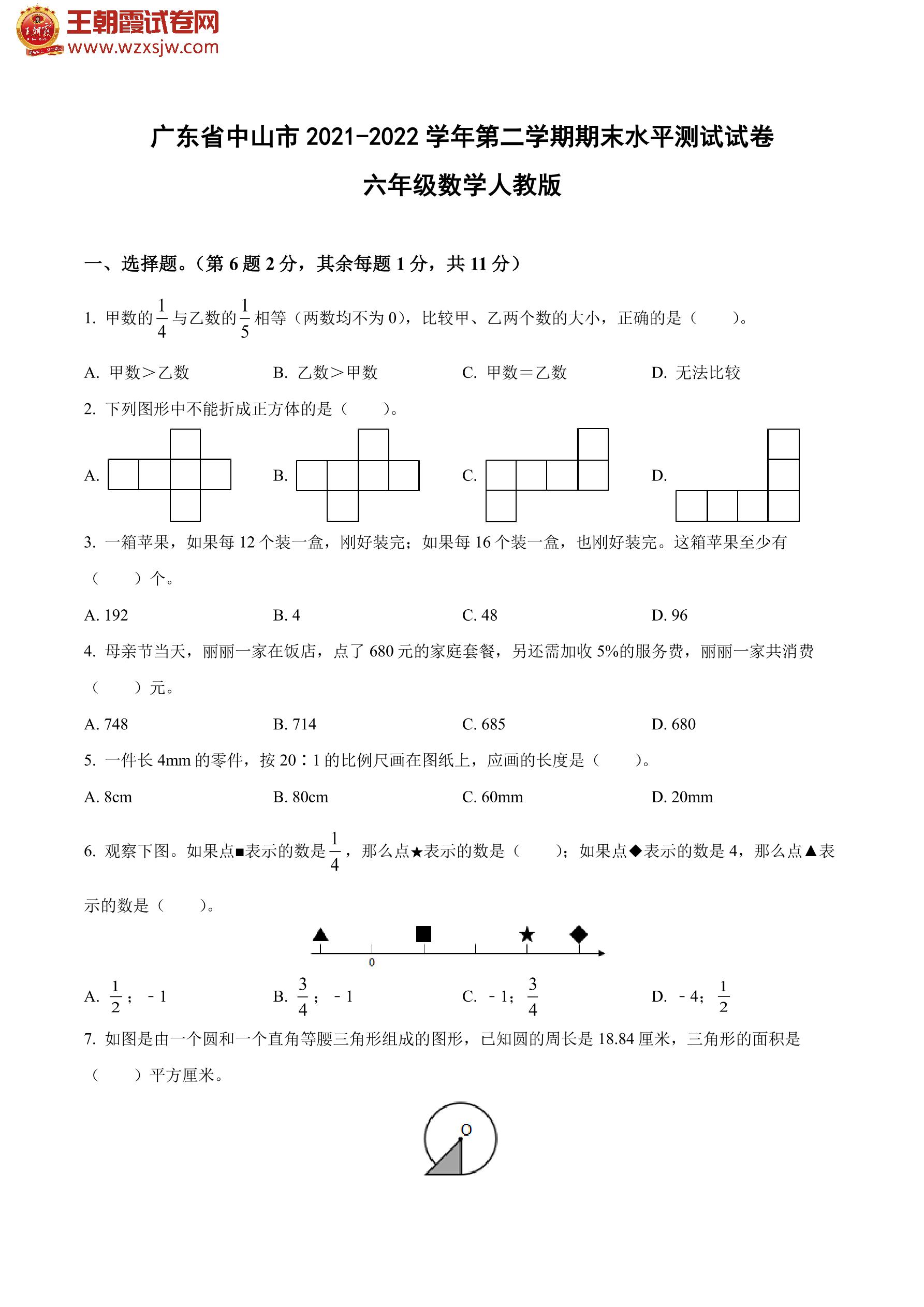 广东省中山市2021-2022学年第二学期期末水平测试试卷六年级数学(人教版)