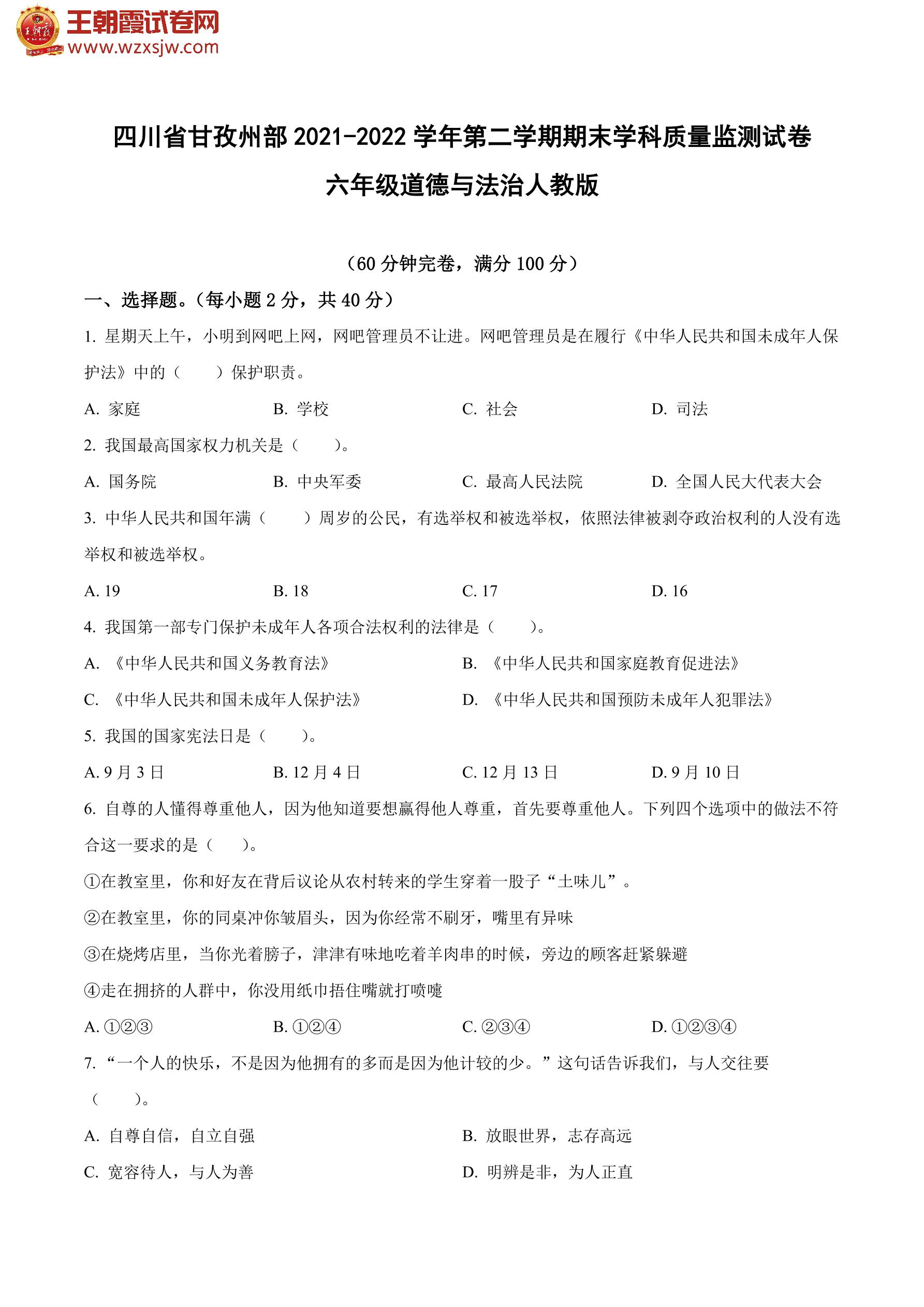 四川省甘孜州部2021-2022学年第二学期期末学科质量监测试卷六年级道德与法治(人教版)