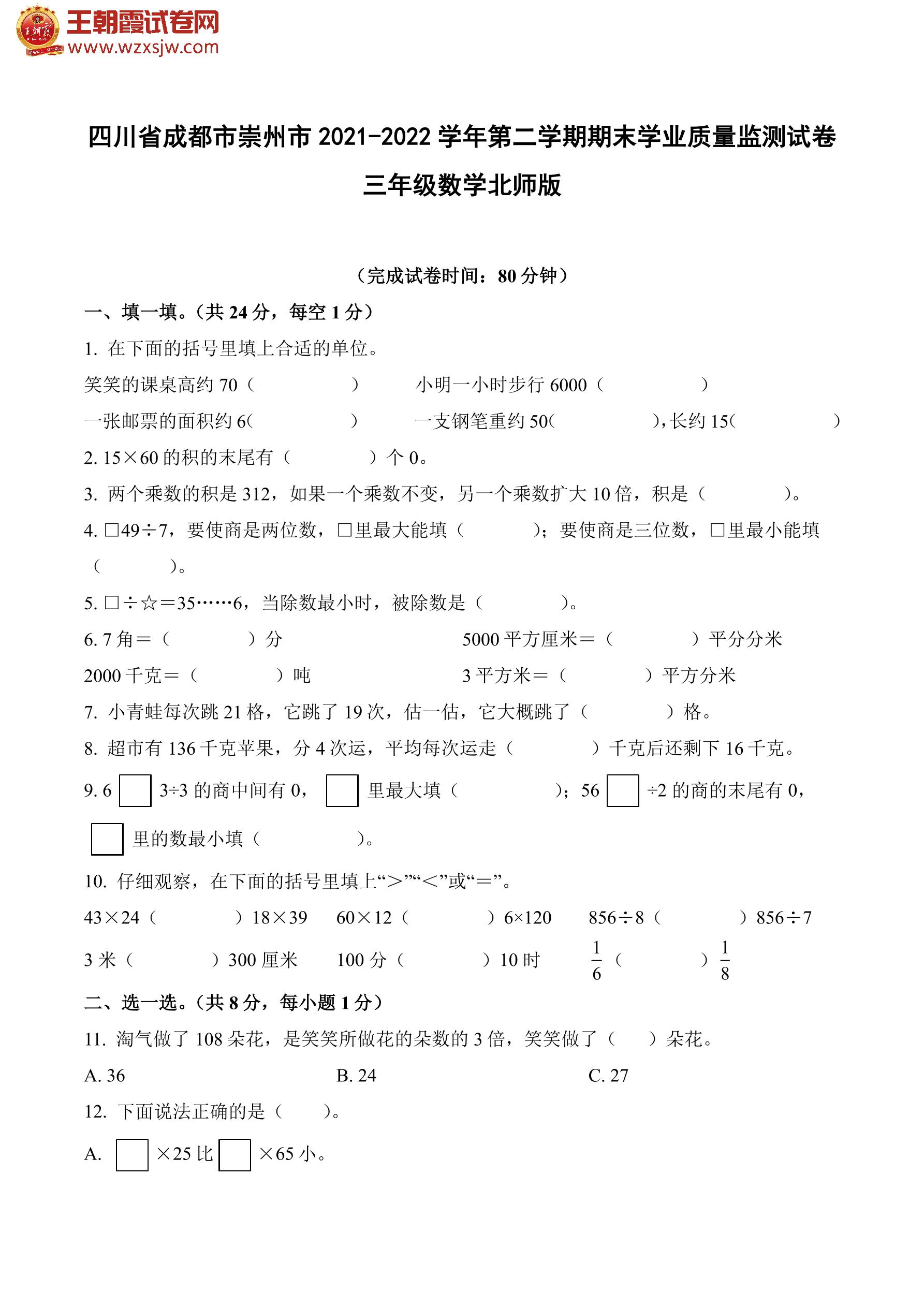 四川省成都市崇州市2021-2022学年第二学期期末学业质量监测试卷三年级数学(北师版)