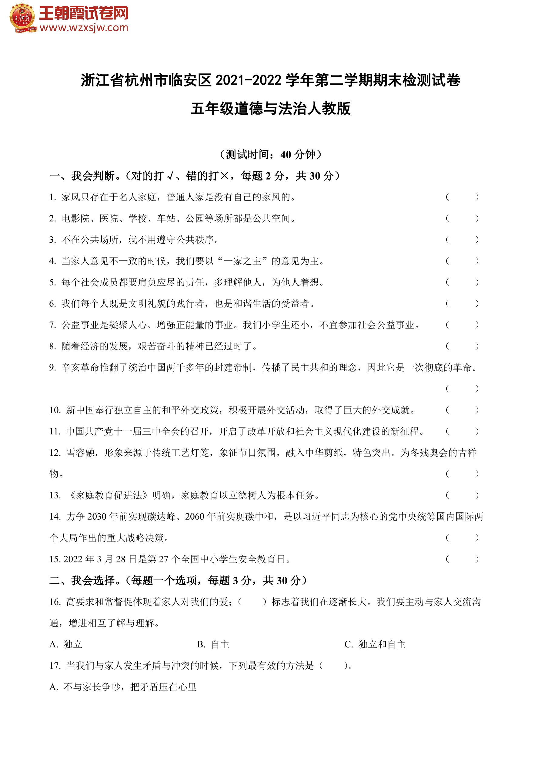 浙江省杭州市临安区2021-2022学年第二学期期末检测试卷五年级道德与法治(人教版)