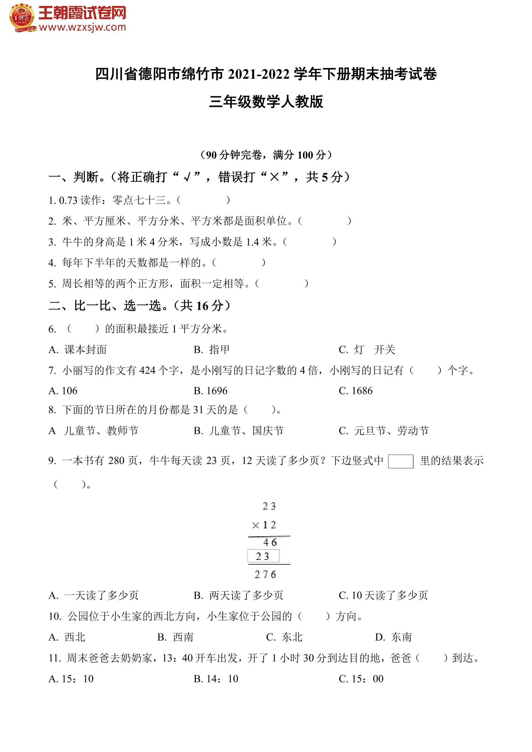四川省德阳市绵竹市2021-2022学年下册期末抽考试卷三年级数学(人教版)