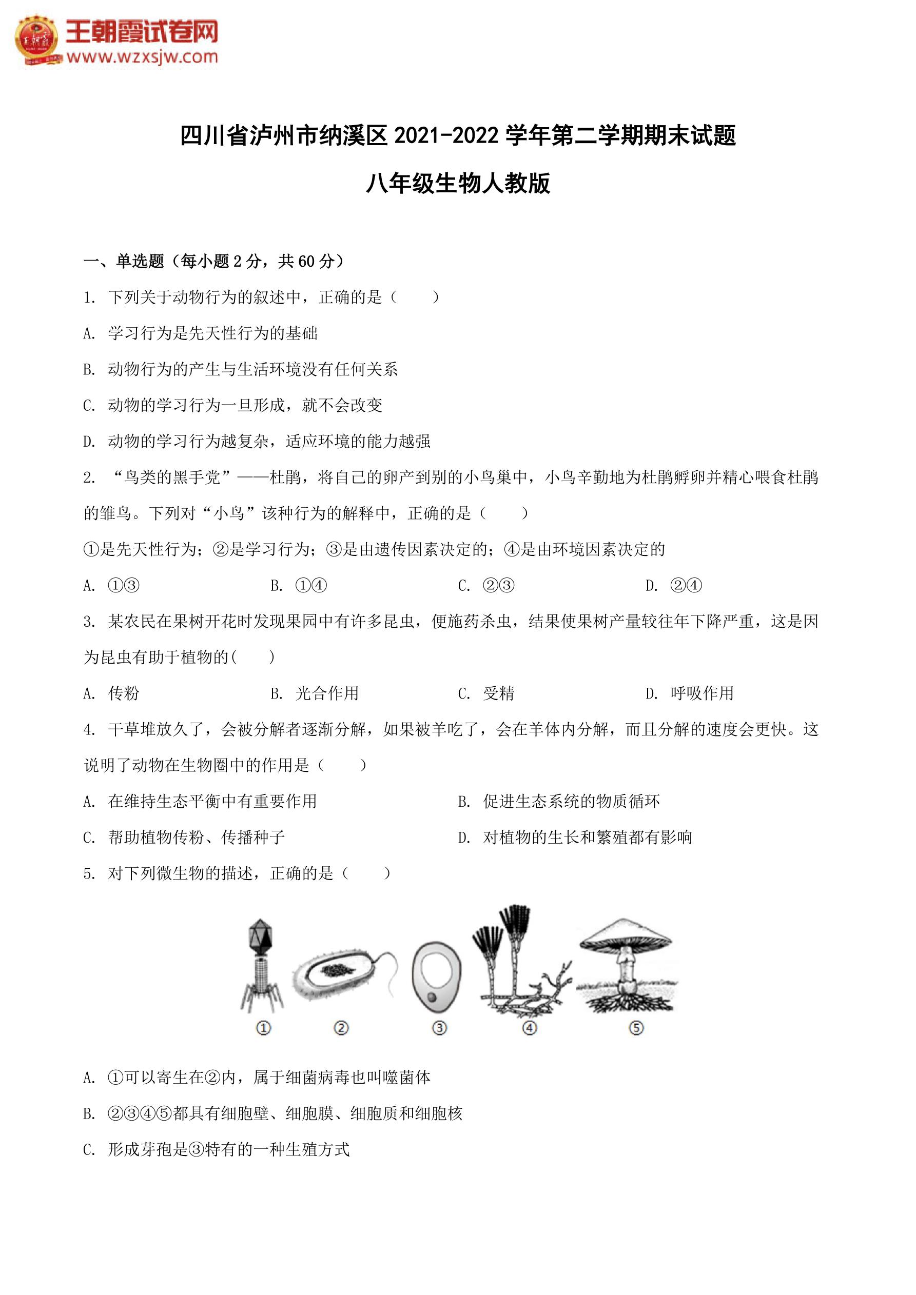 四川省泸州市纳溪区2021-2022学年第二学期期末试题八年级生物(人教版)