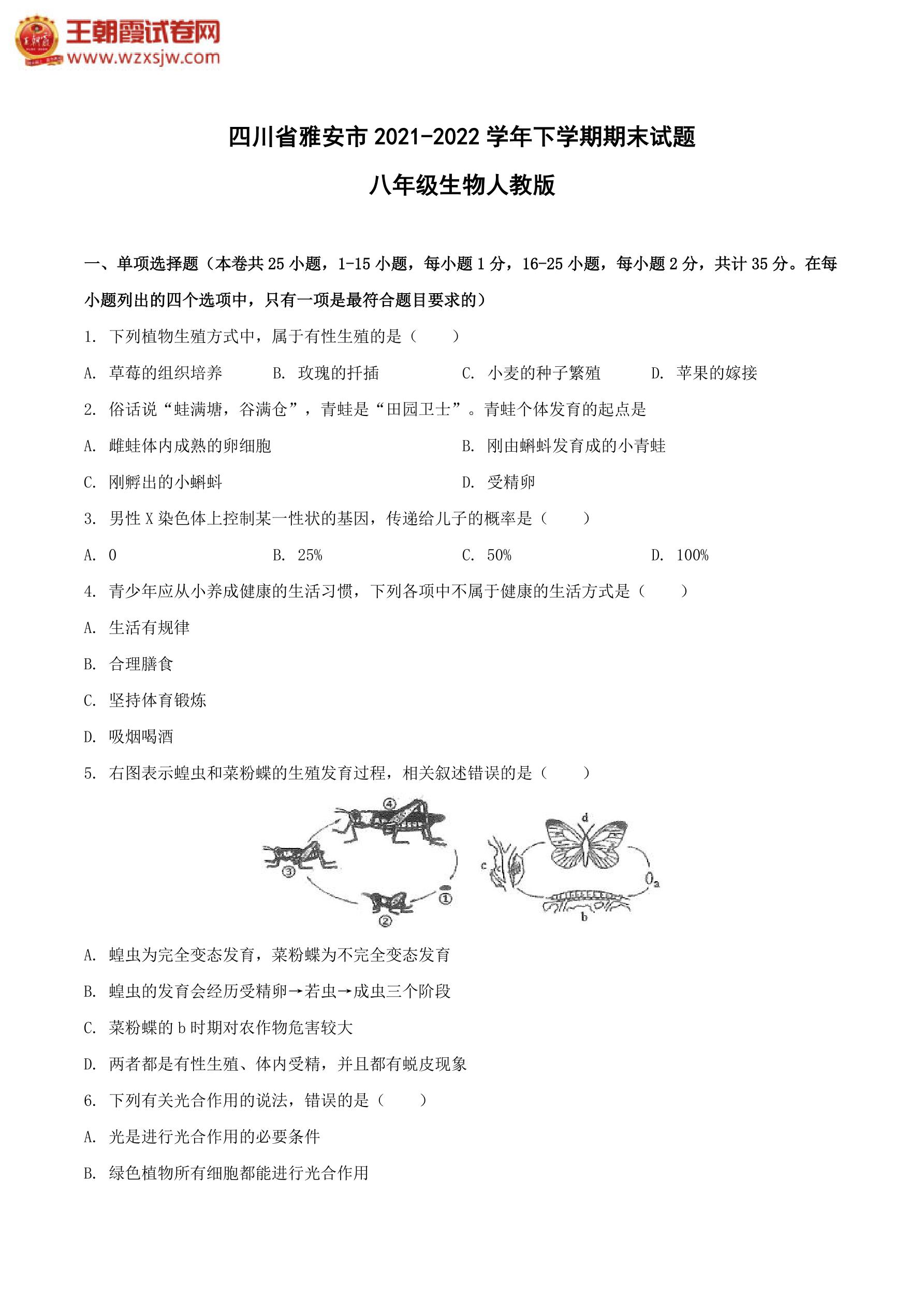 四川省雅安市2021-2022学年下学期期末试题八年级生物(人教版)