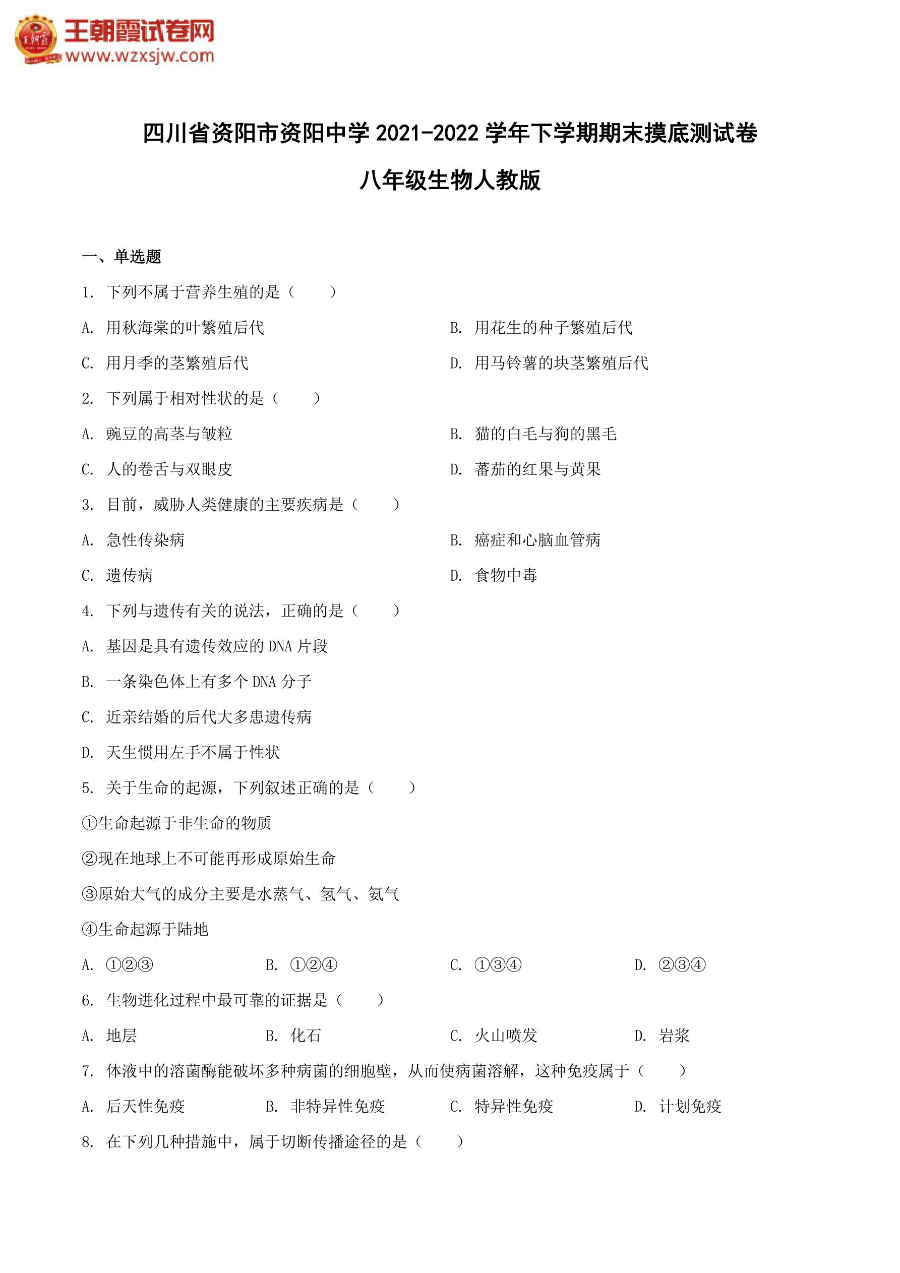 四川省资阳市资阳中学2021-2022学年下学期期末摸底测试卷八年级生物(人教版)