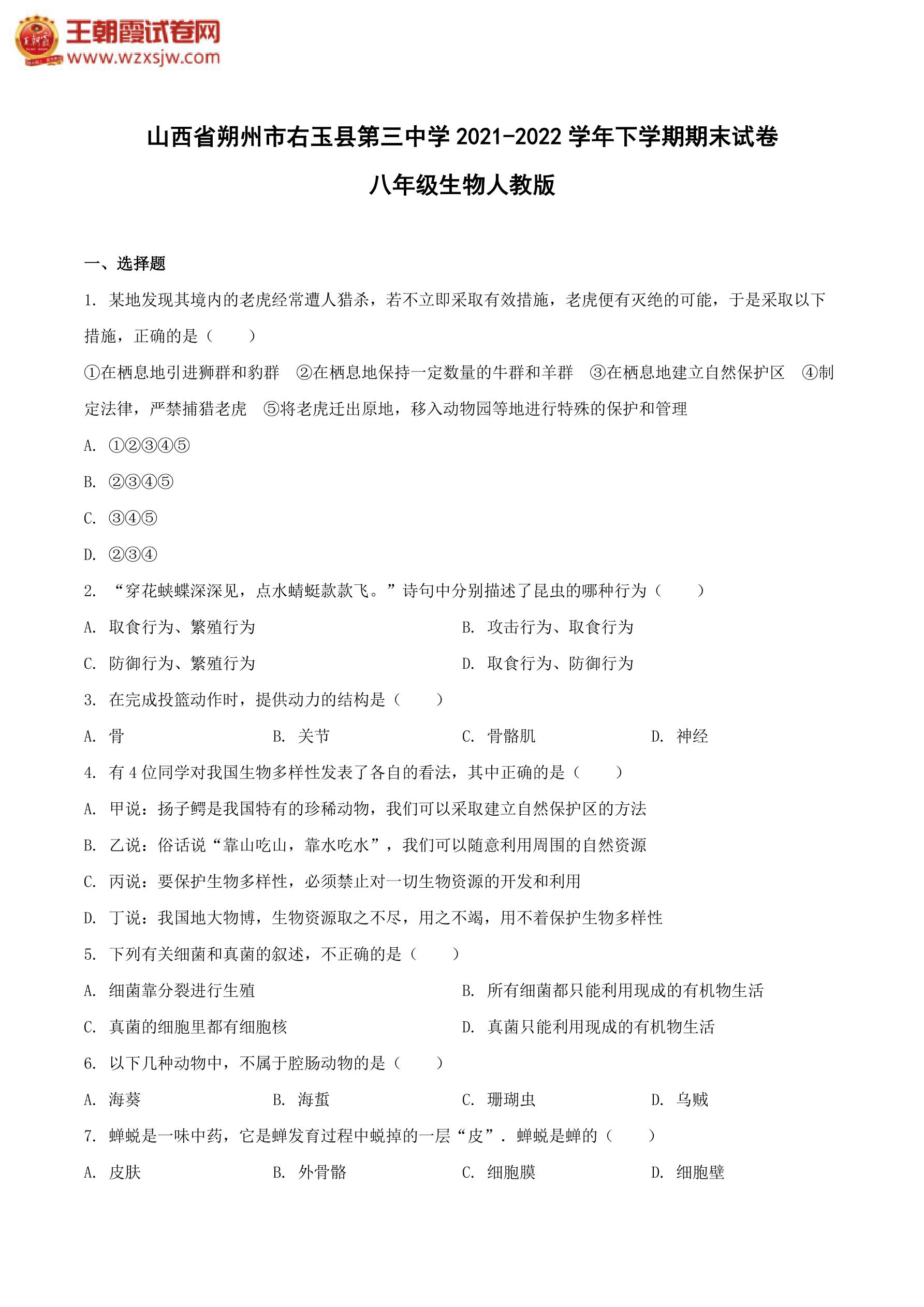 山西省朔州市右玉县第三中学2021-2022学年下学期期末试卷八年级生物(人教版)