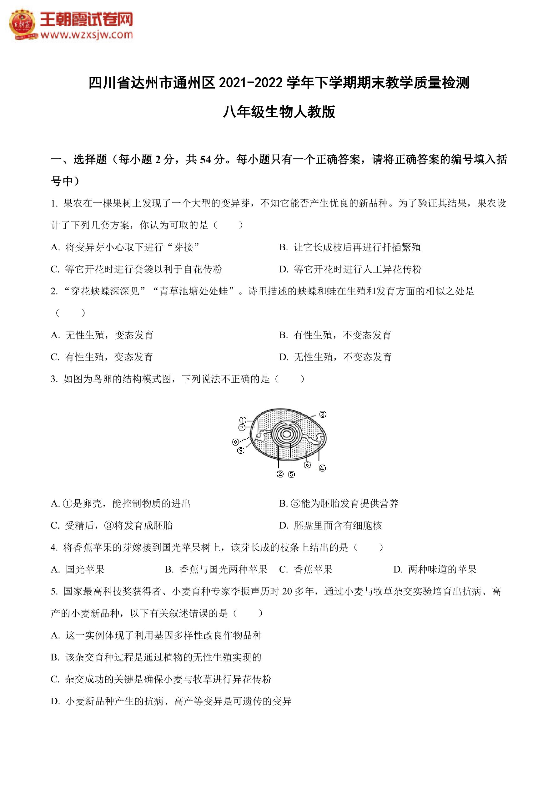 四川省达州市通川区2021-2022学年下学期期末教学质量检测八年级生物(人教版)