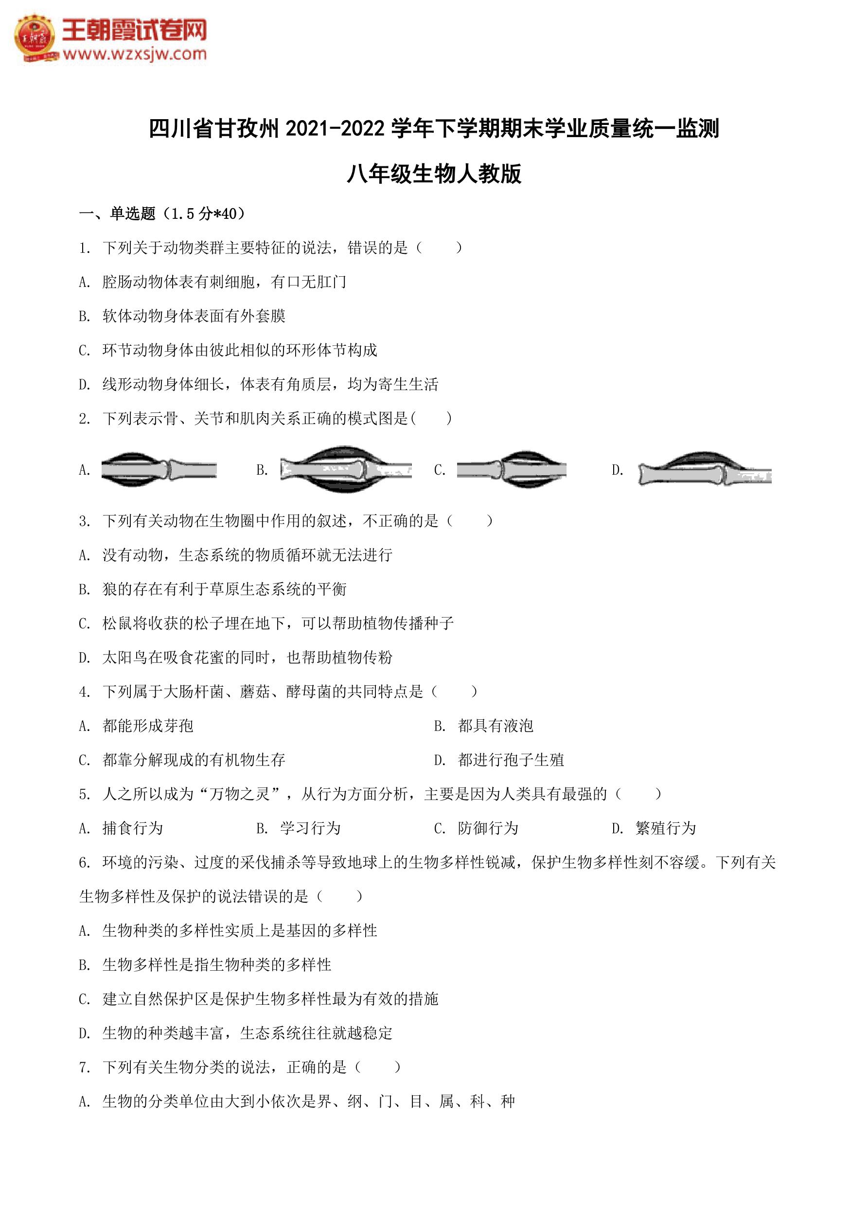 四川省甘孜州2021-2022学年下学期期末学业质量统一监测八年级生物(人教版)