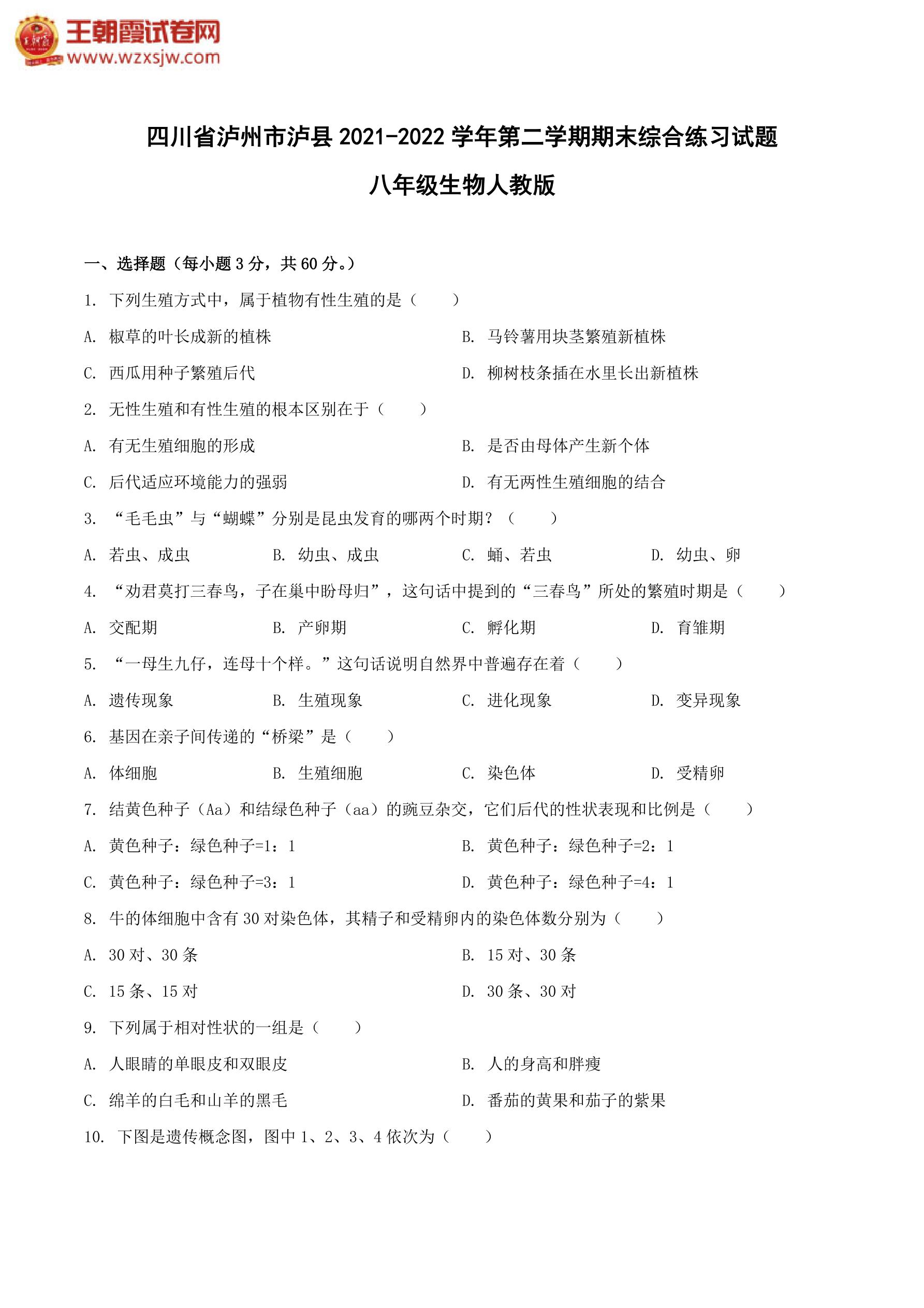四川省泸州市泸县2021-2022学年第二学期期末综合练习试题八年级生物(人教版)