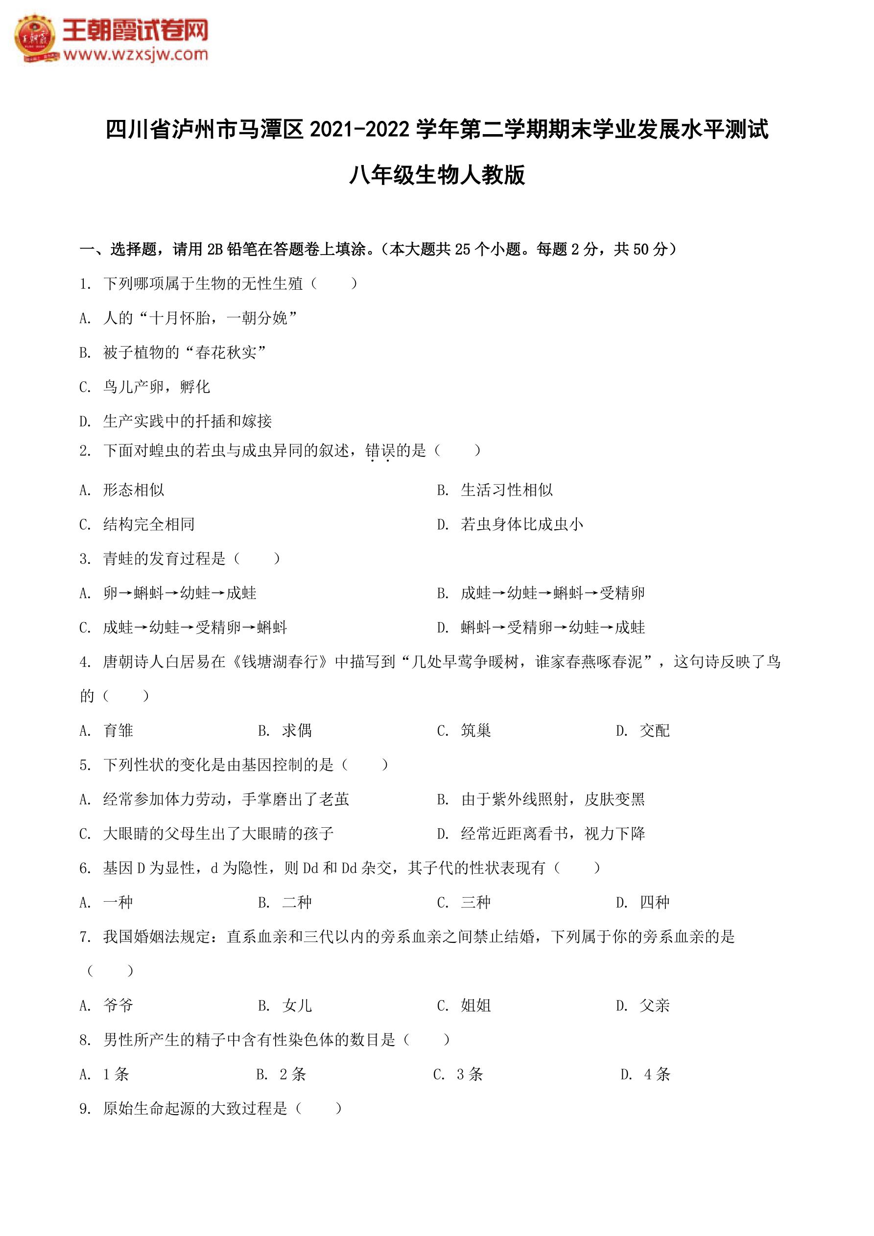 四川省泸州市龙马潭区2021-2022学年第二学期期末学业发展水平测试八年级生物(人教版)