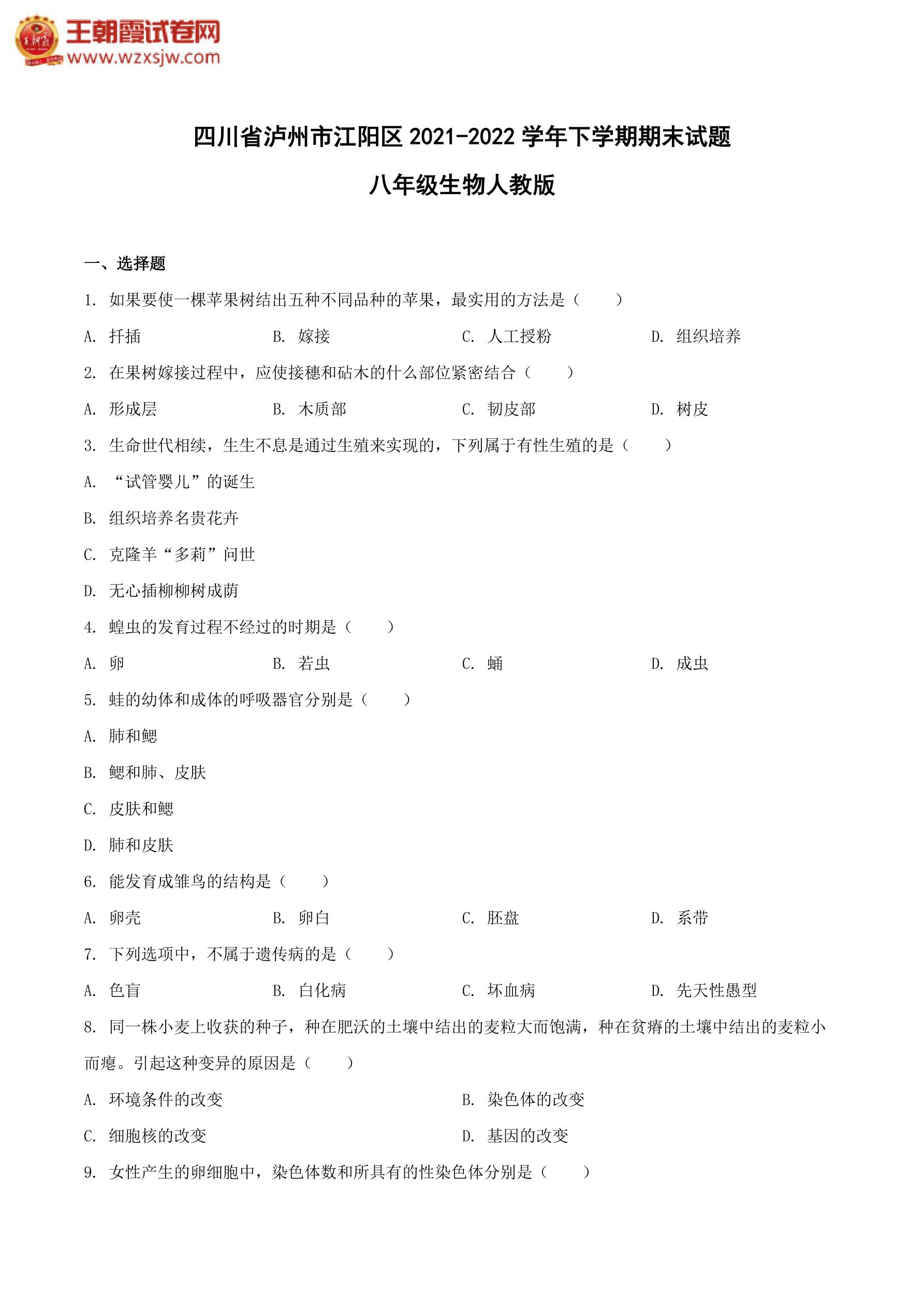 四川省泸州市江阳区2021-2022学年下学期期末试题八年级生物(人教版)