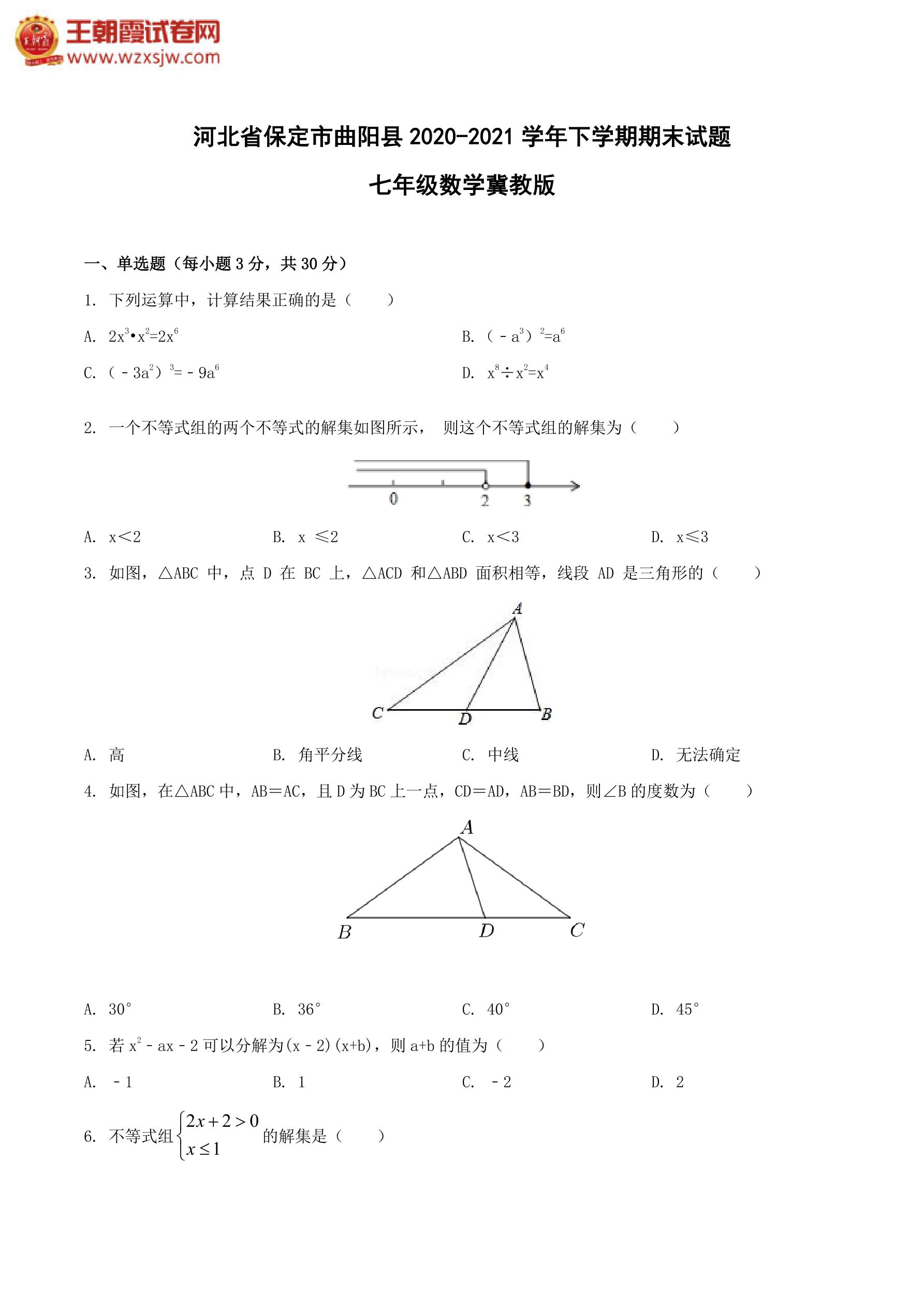 河北省保定市曲阳县2020-2021学年下学期期末试题七年级数学(冀教版)