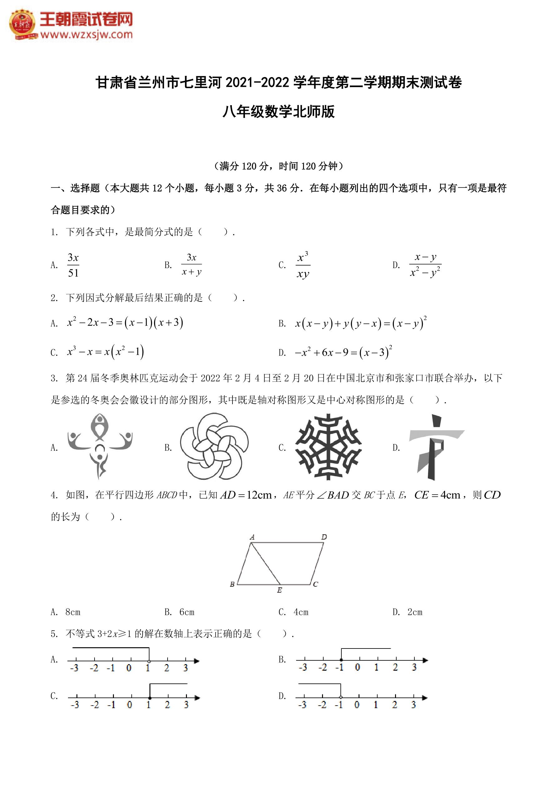 甘肃省兰州市七里河区2021-2022学年第第二学期期末测试卷八年级数学(北师版)