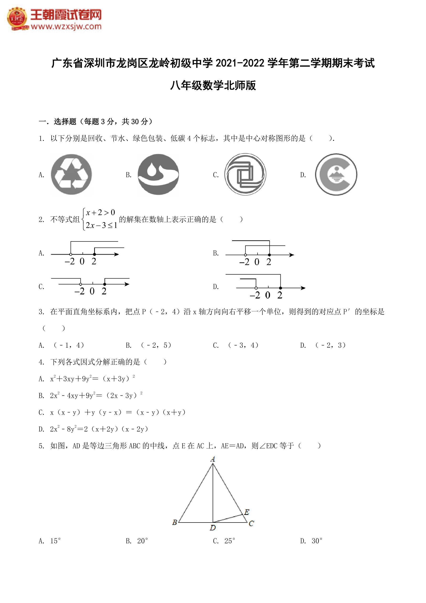 广东省深圳市龙岗区龙岭初级中学2021-2022学年第二学期期末考试八年级数学(北师版)