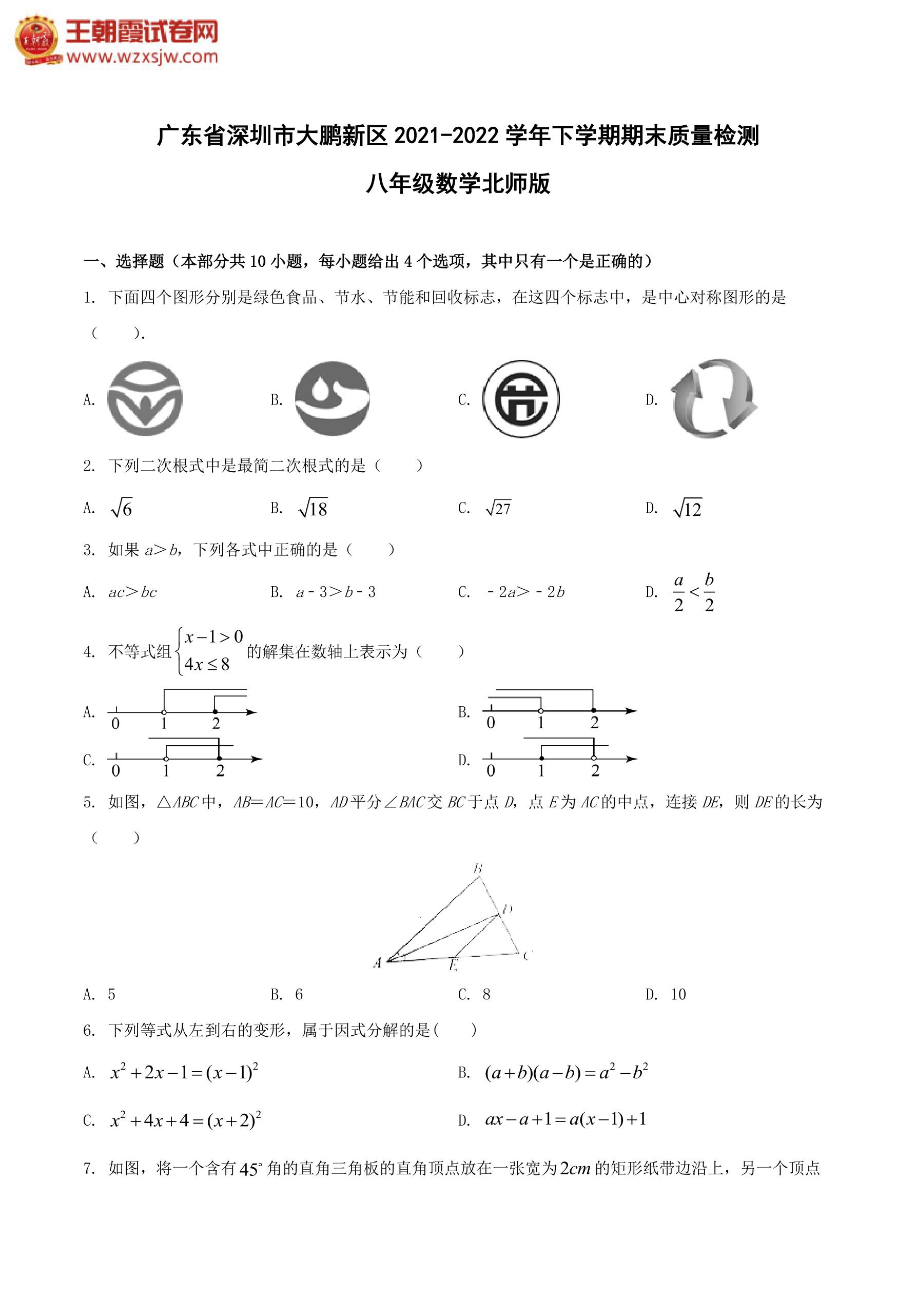广东省深圳市大鹏新区2021-2022学年下学期期末质量检测八年级数学(北师版)