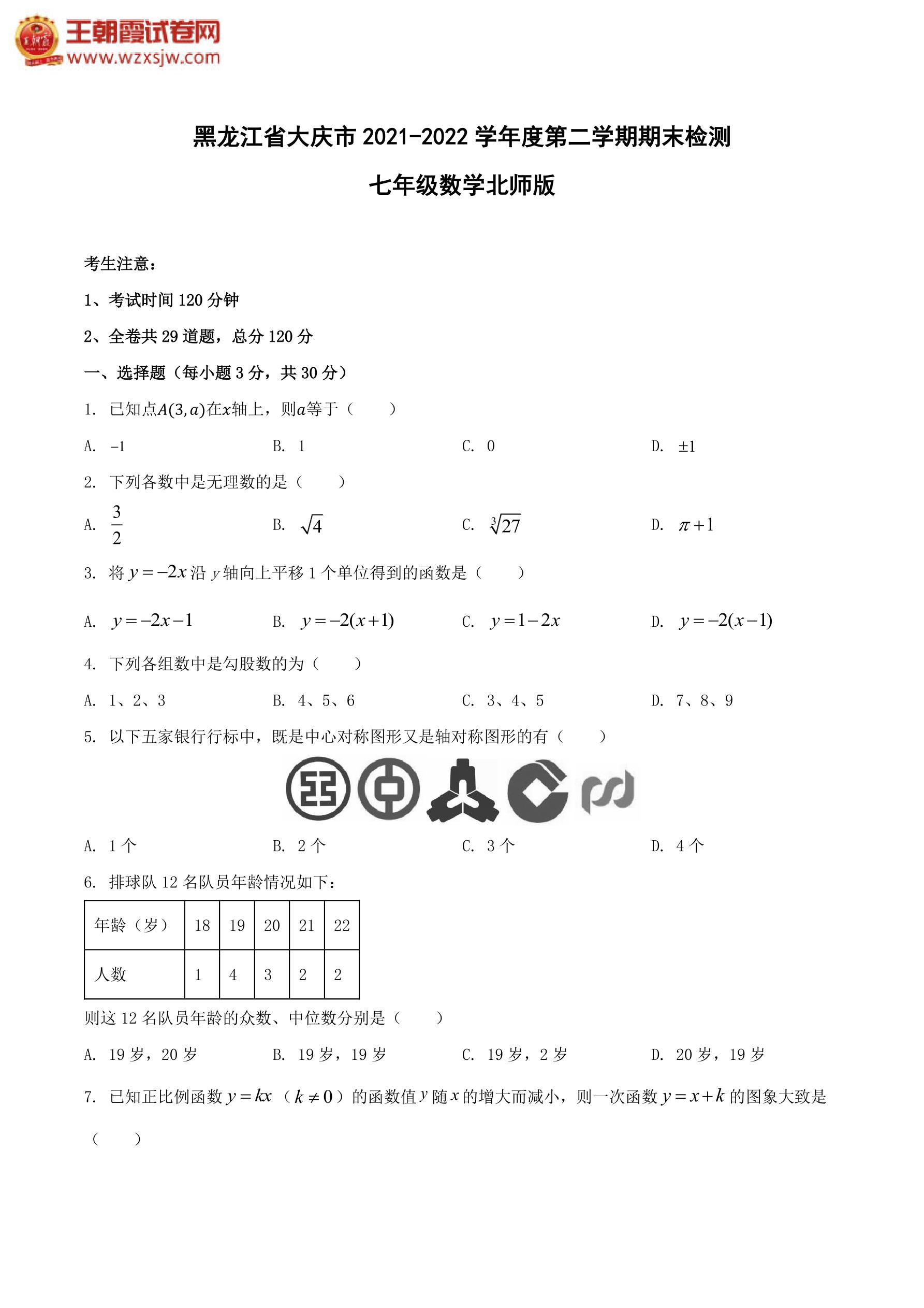 黑龙江省大庆2021-2022学年度第二学期期末检测七年级数学(北师版)