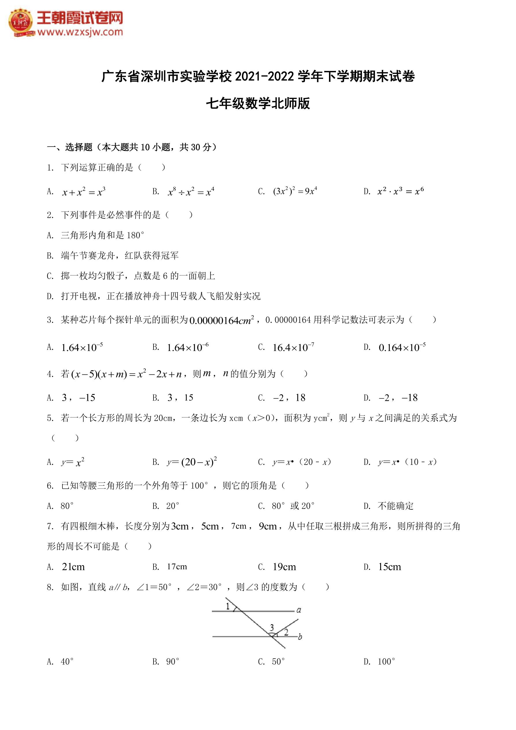 广东省深圳市实验学校2021-2022学年下学期期末试卷 七年级数学(北师版)