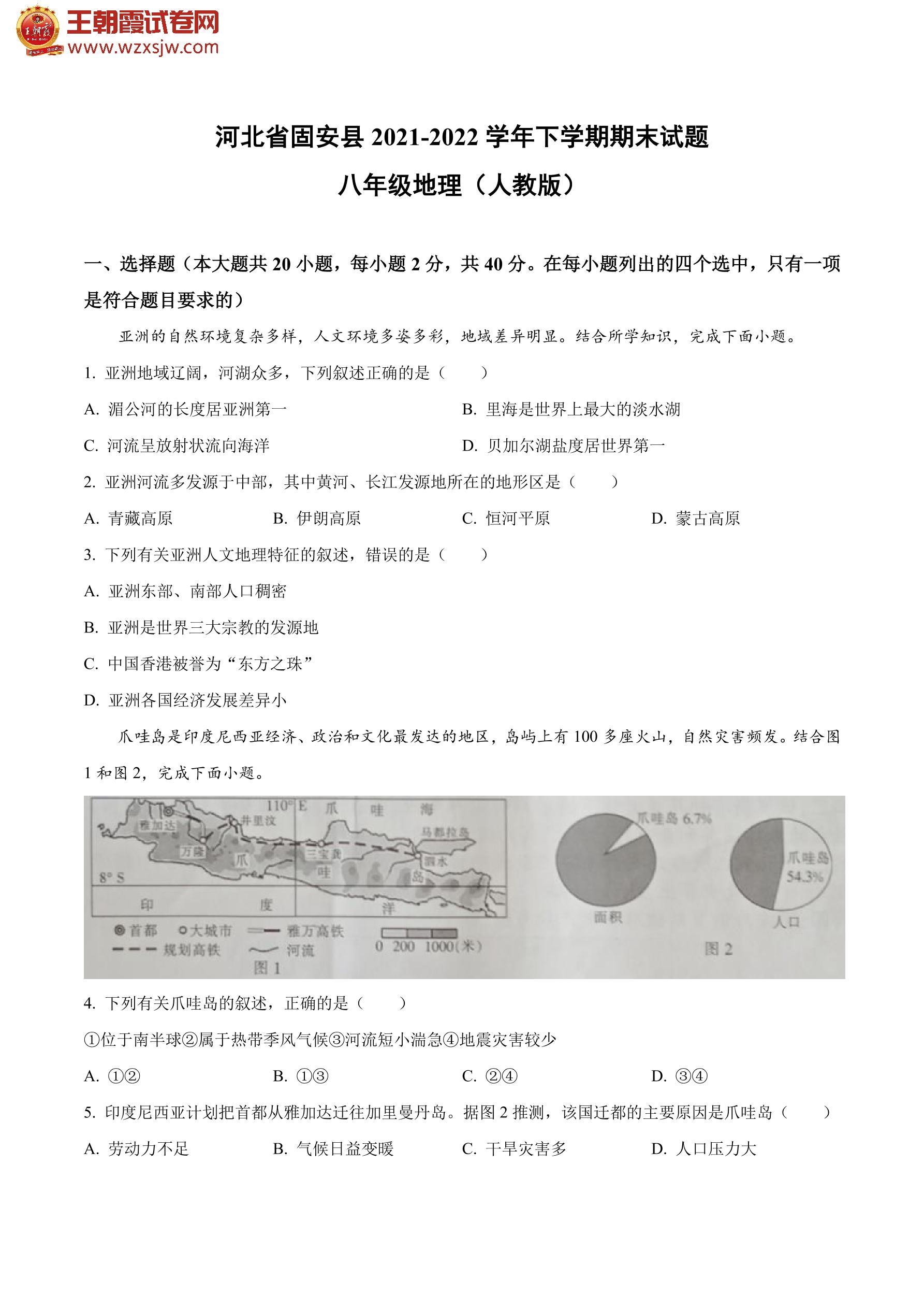 河北省固安县2021-2022学年下学期期末试题八年级地理(人教版)