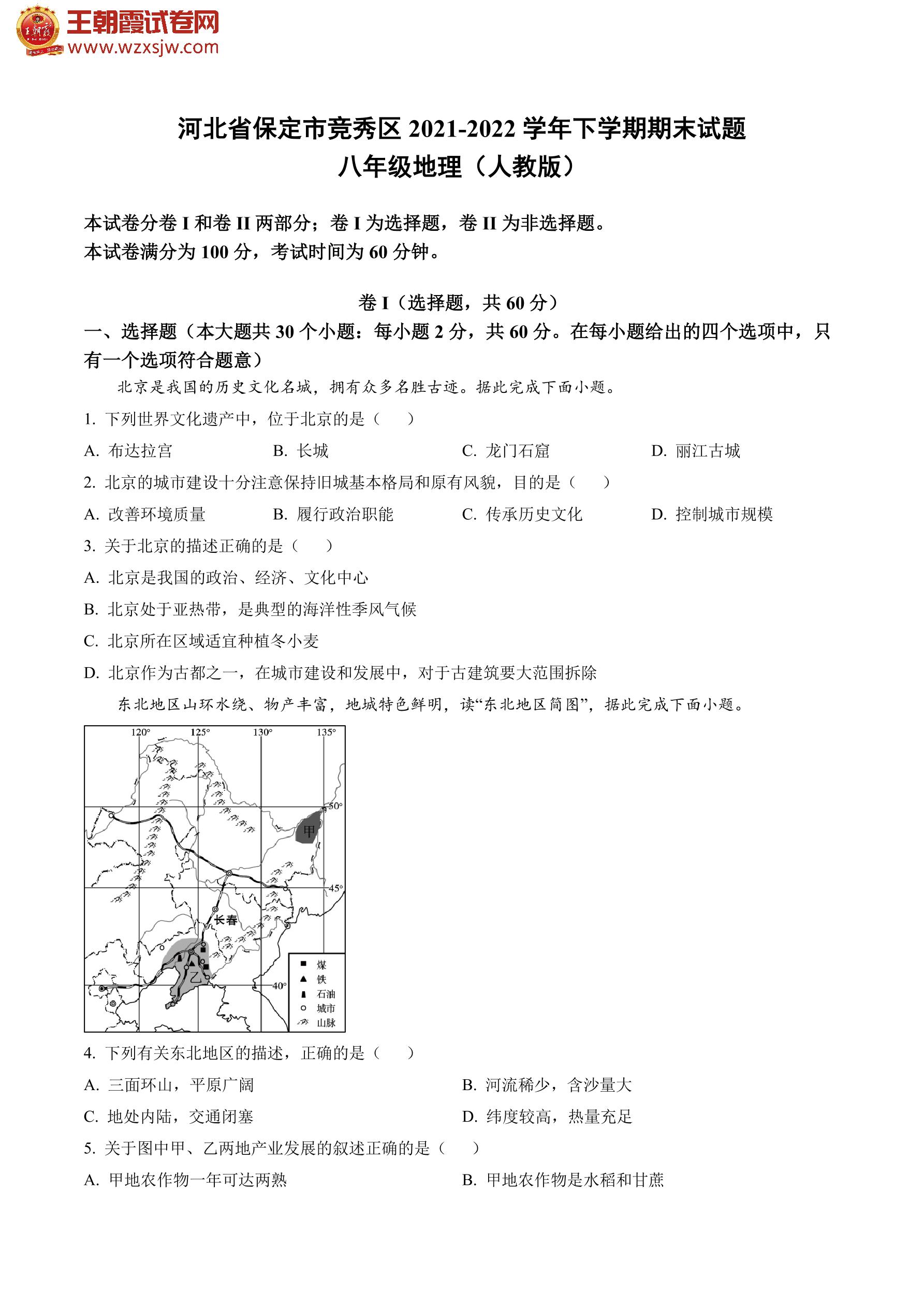 河北省保定市竞秀区2021-2022学年下学期期末试题八年级地理(人教版)