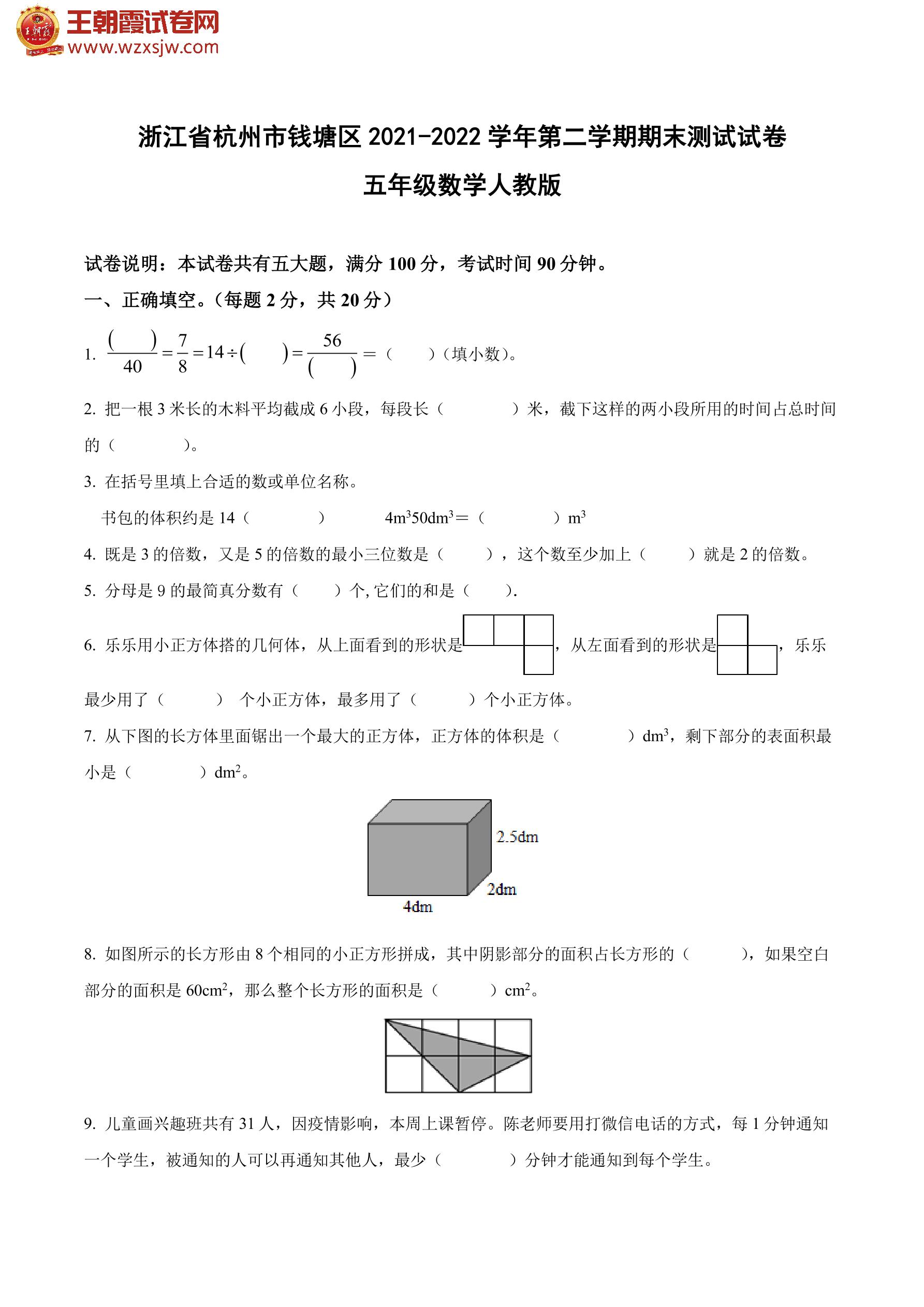 浙江省杭州市钱塘区2021-2022学年第二学期期末测试试卷五年级数学(人教版)