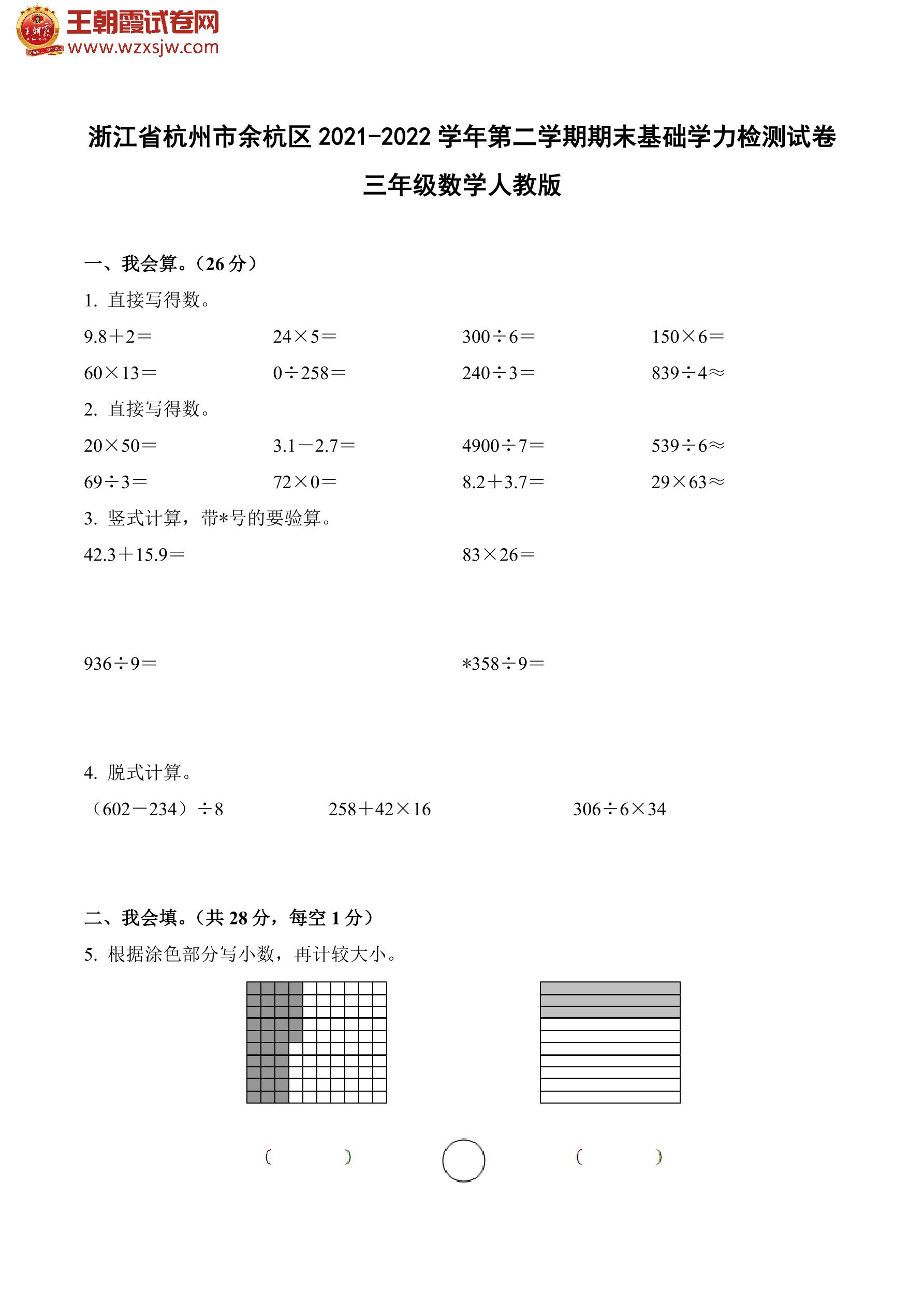 浙江省杭州市余杭区2021-2022学年第二学期期末基础学力检测试卷三年级数学(人教版)