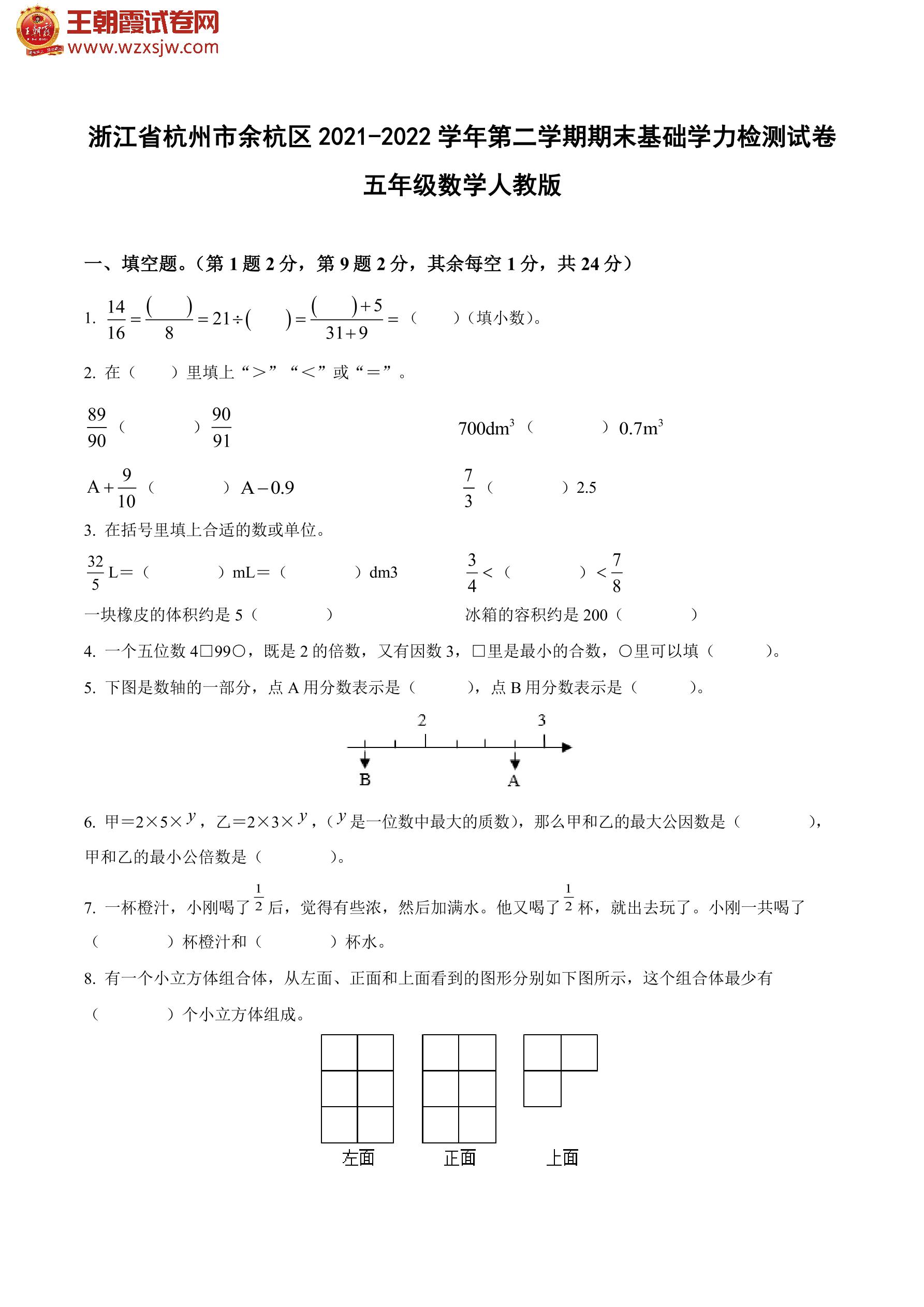 浙江省杭州市余杭区2021-2022学年第二学期期末基础学力检测试卷五年级数学(人教版)