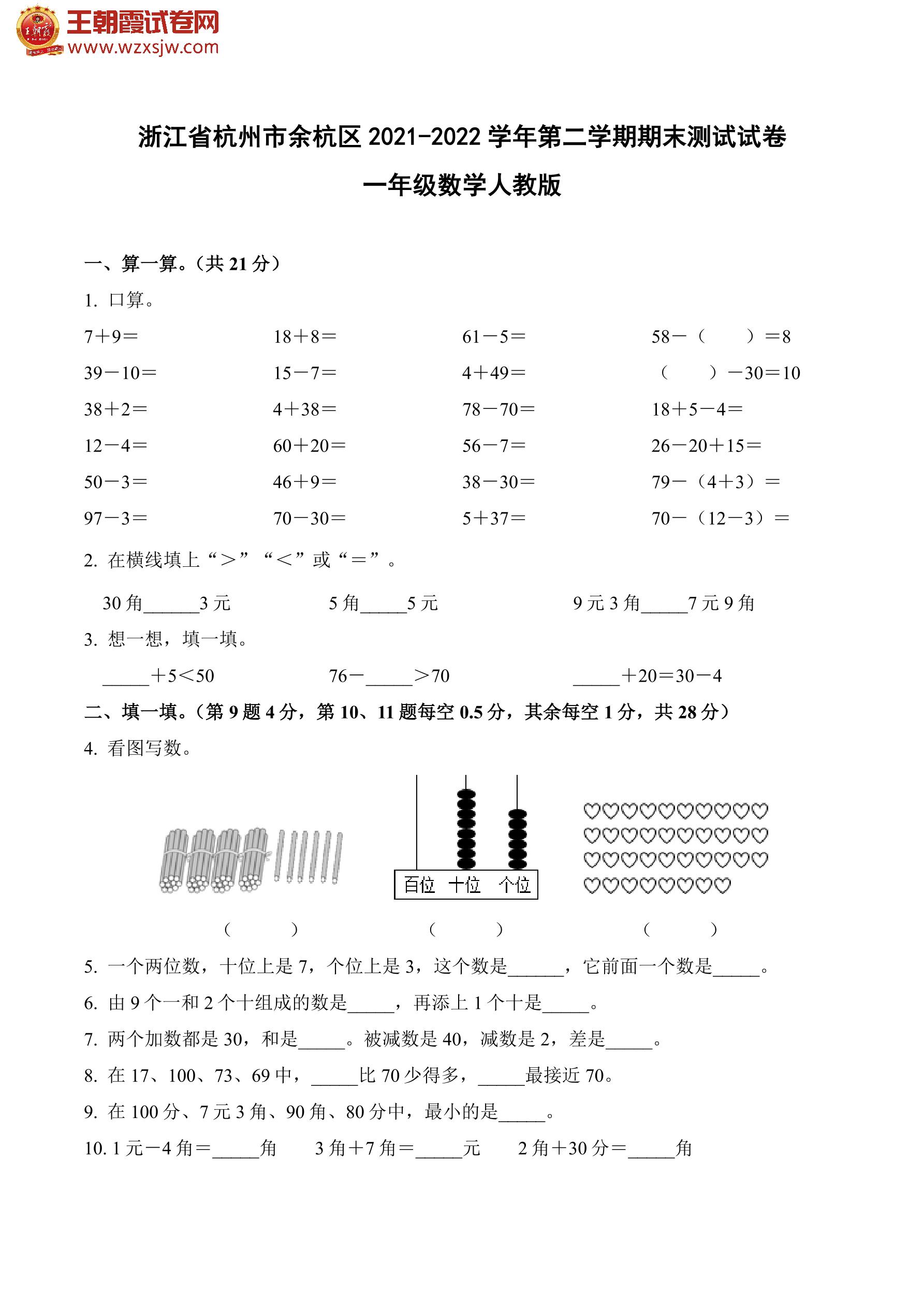 浙江省杭州市余杭区2021-2022学年第二学期期末测试试卷一年级数学(人教版)