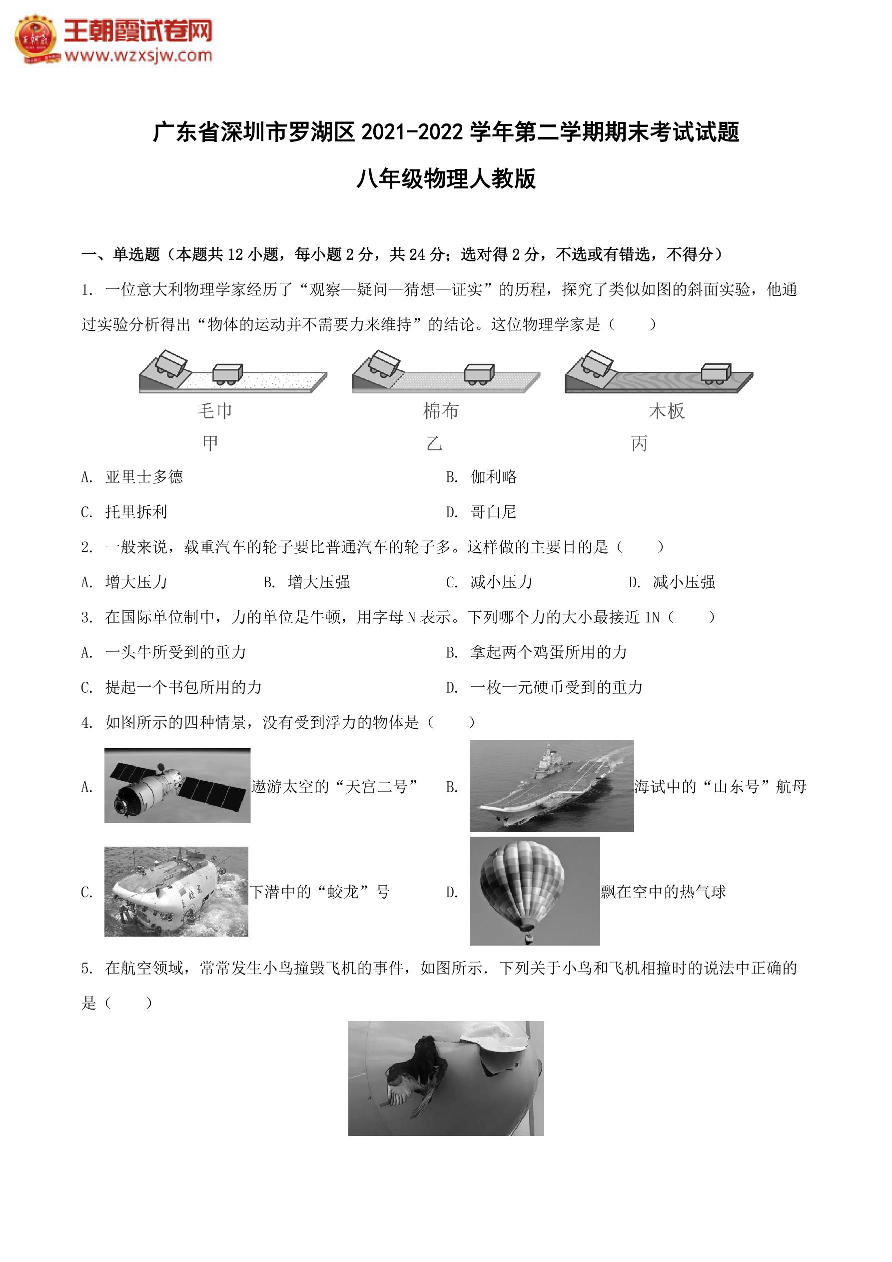 广东省深圳市罗湖区2021-2022学年第二学期期末考试试题八年级物理(人教版)