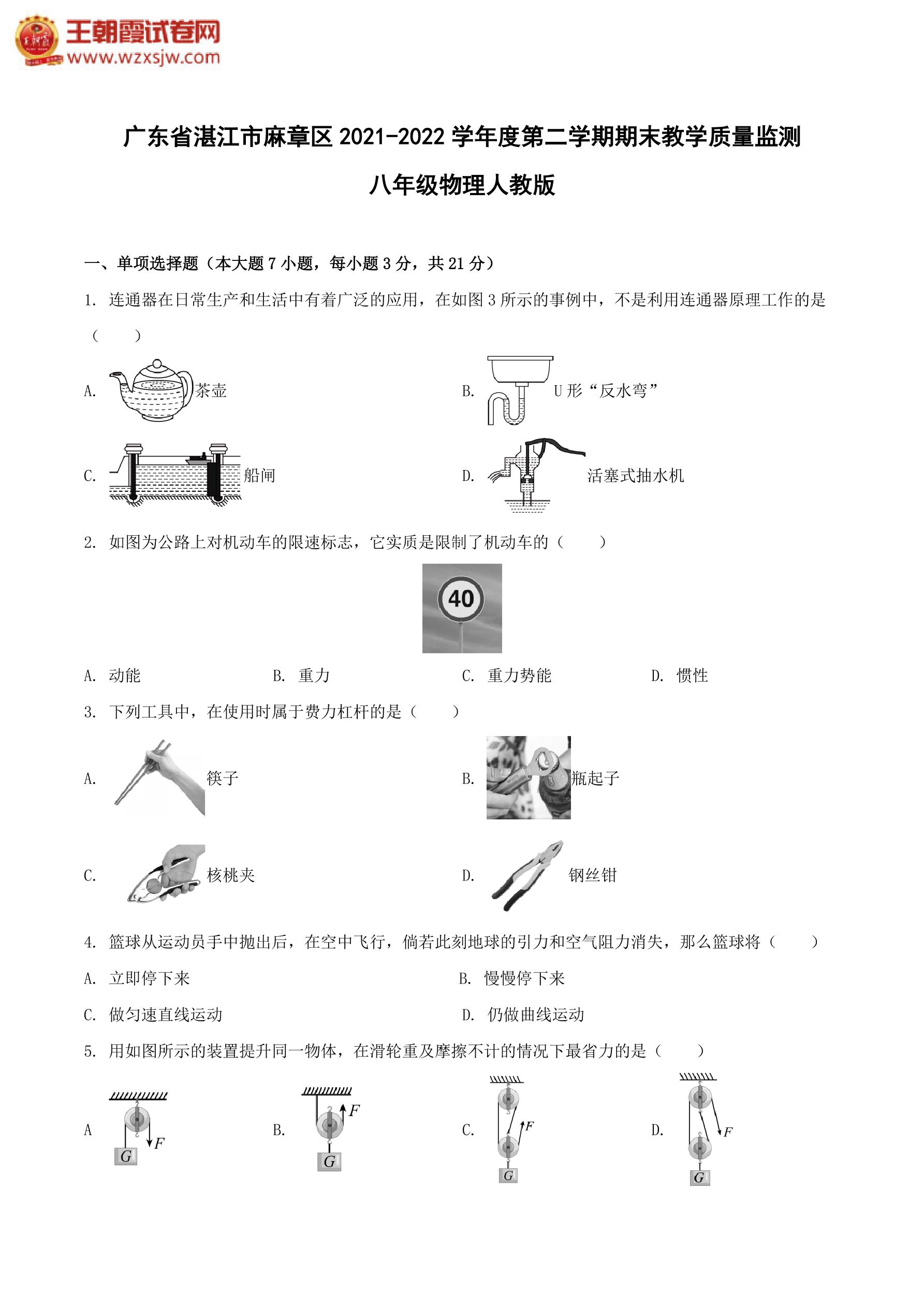 广东省湛江市麻章区2021-2022学年度第二学期期末教学质量监测八年级物理(人教版)