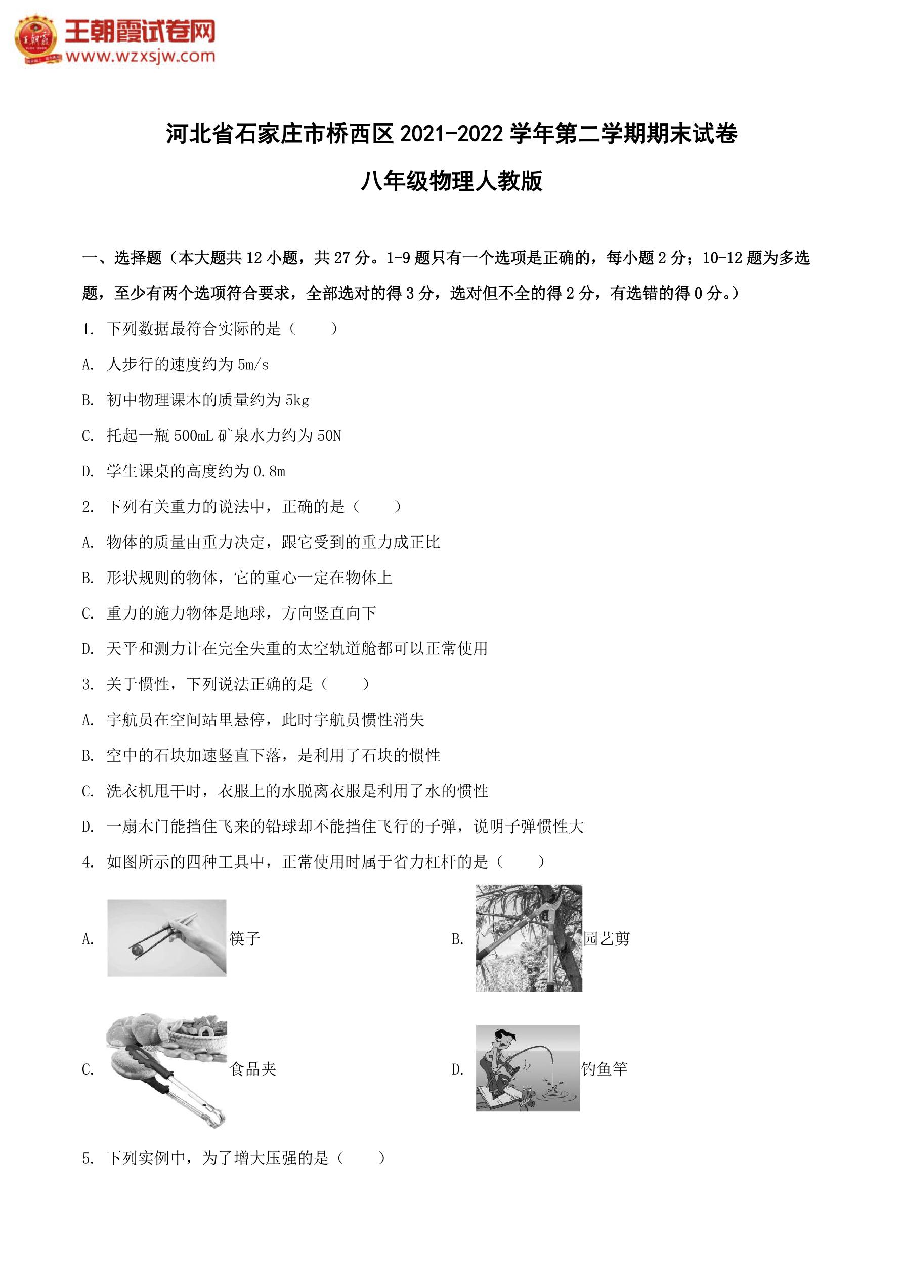 河北省石家庄市桥西区2021-2022学年第二学期期末试卷八年级物理(人教版)