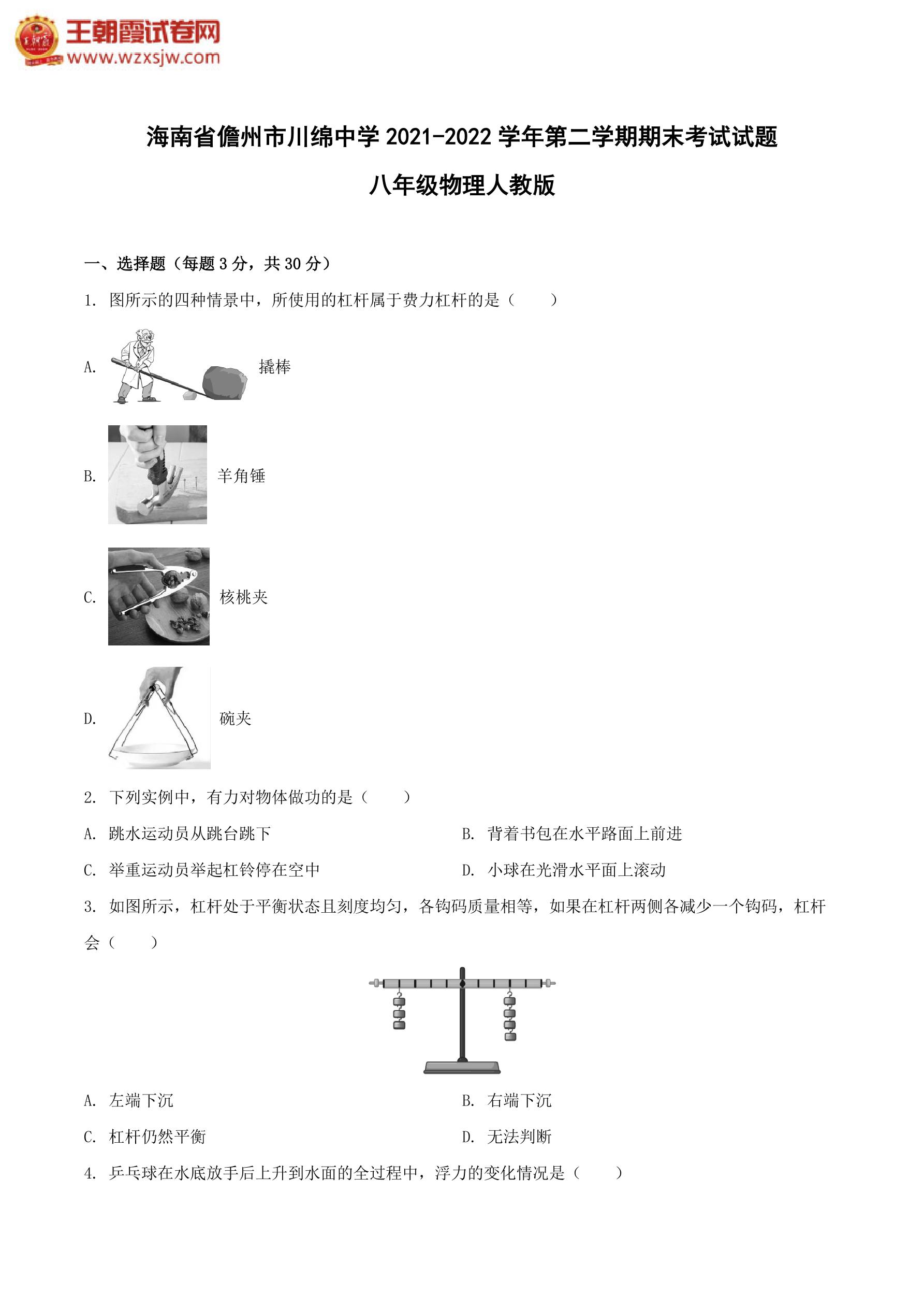 海南省儋州市川绵中学2021-2022学年第二学期期末考试试题八年级物理(人教版)