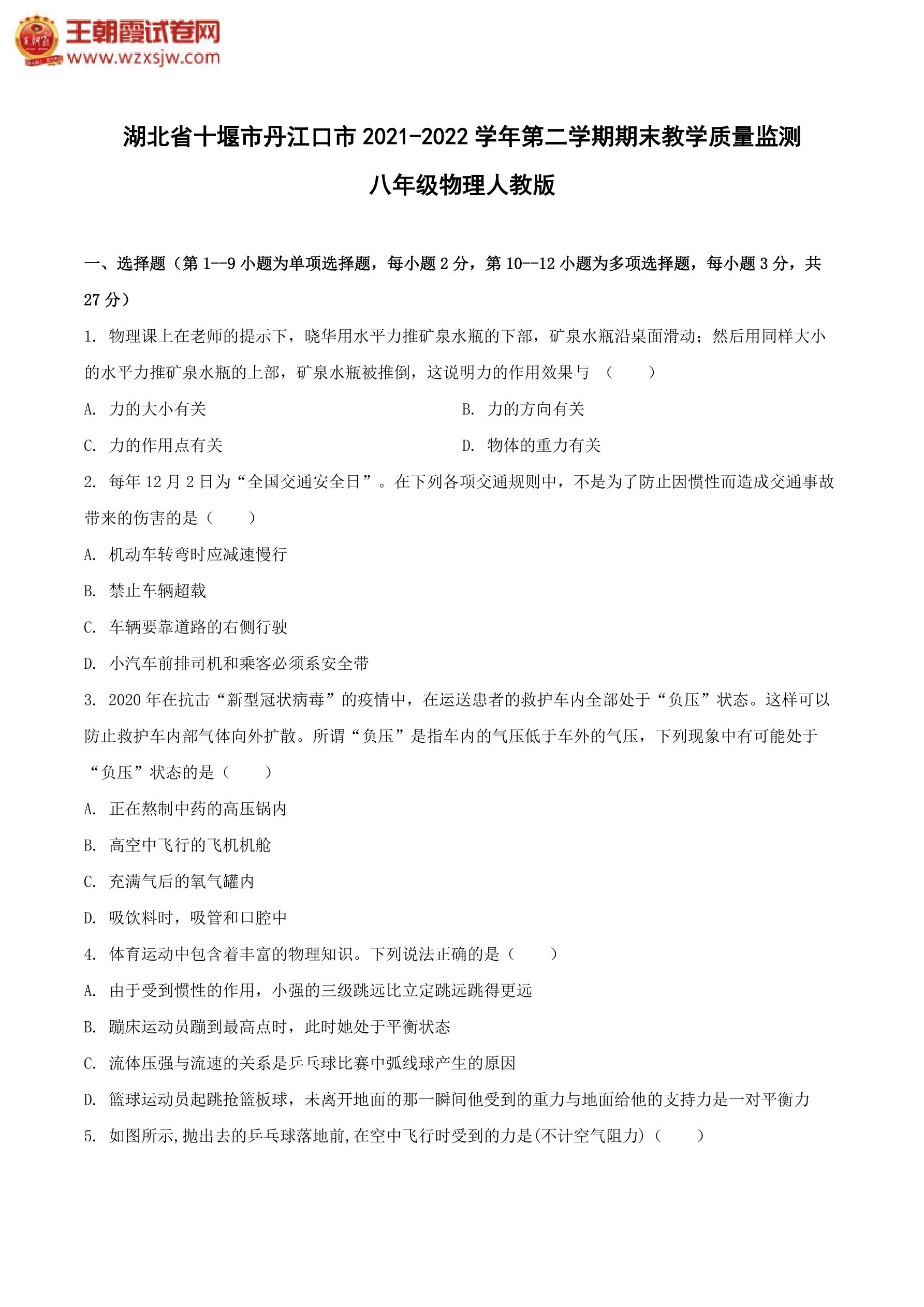 湖北省十堰市丹江口市2021-2022学年第二学期期末教学质量监测八年级物理(人教版)