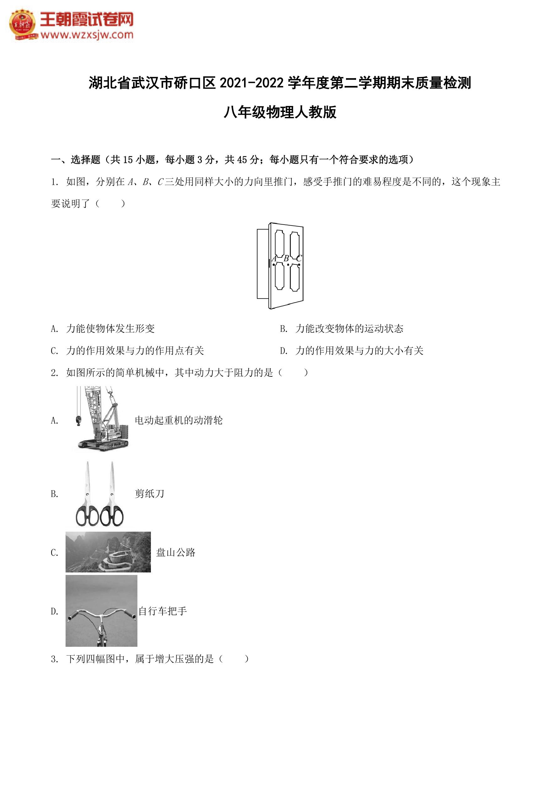 湖北省武汉市硚口区2021-2022学年度第二学期期末质量检测八年级物理(人教版)