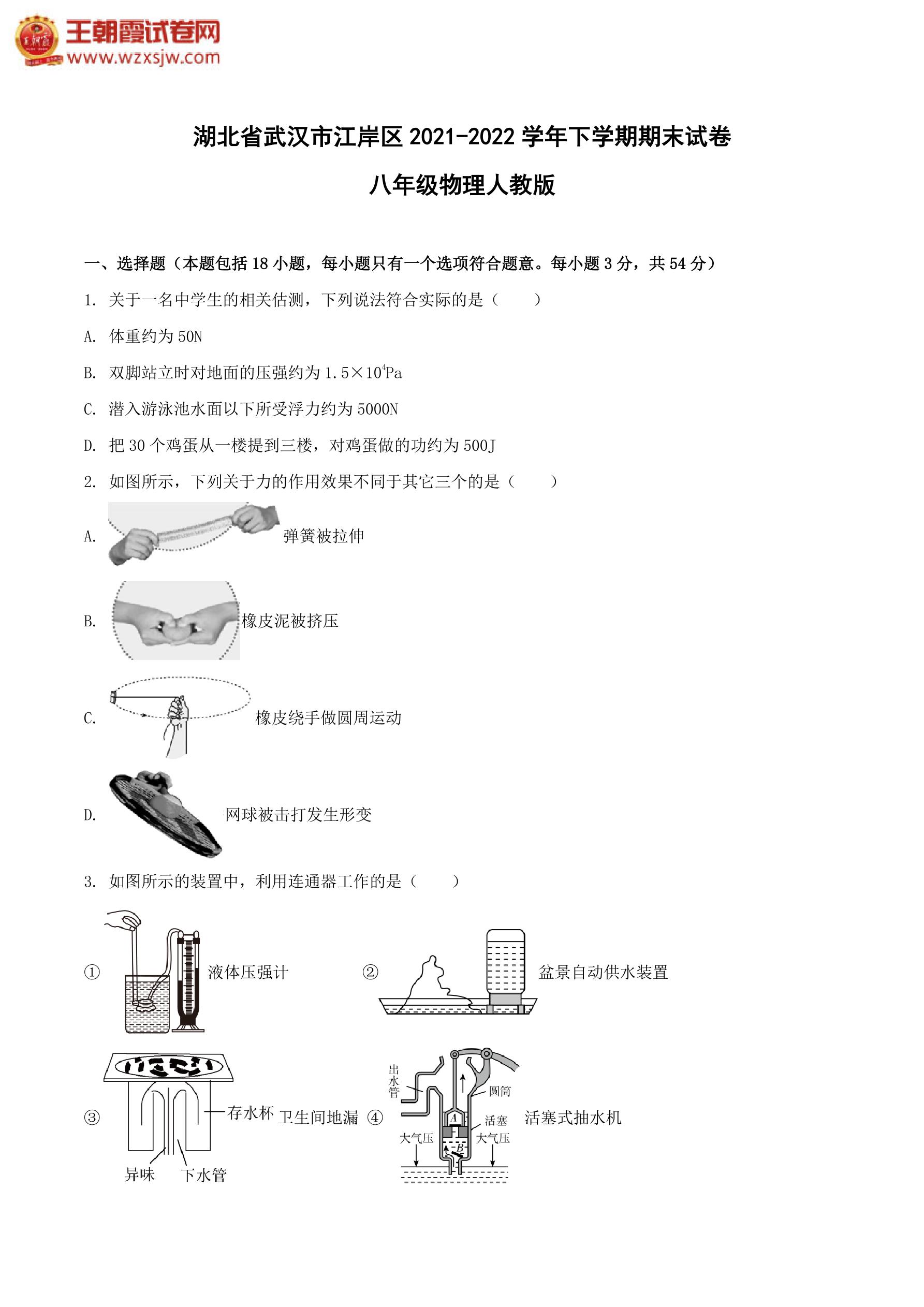 湖北省武汉市江岸区2021-2022学年下学期期末试卷八年级物理(人教版)