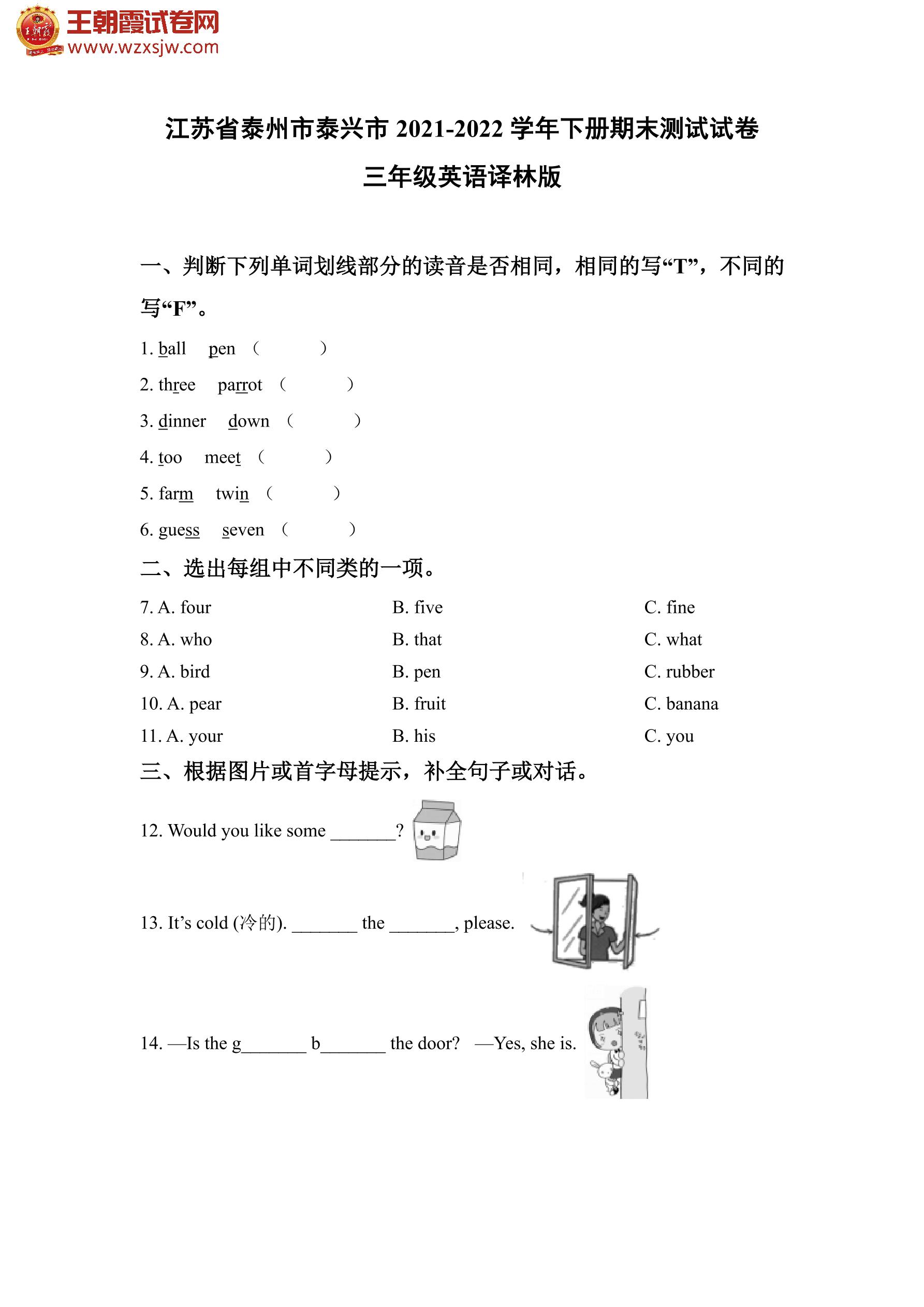 江苏省泰州市泰兴市2021-2022学年下册期末测试试卷三年级英语(译林版)【无听力音频】