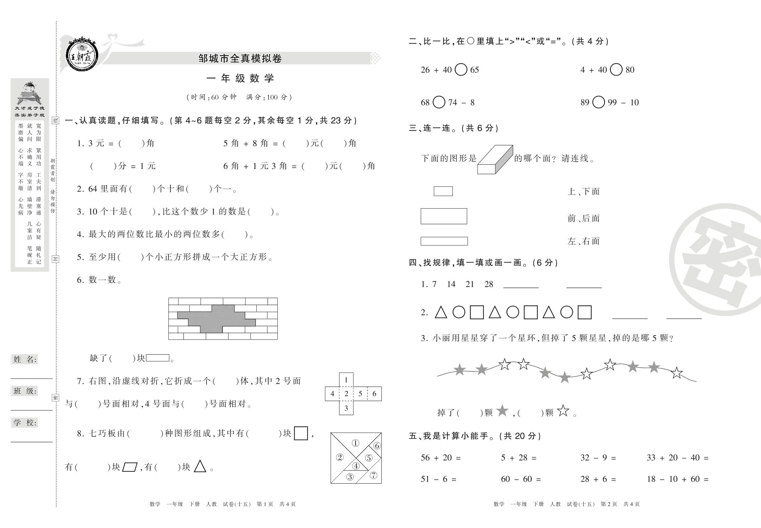 邹城市全真模拟卷一年级下册数学(人教版)【15】