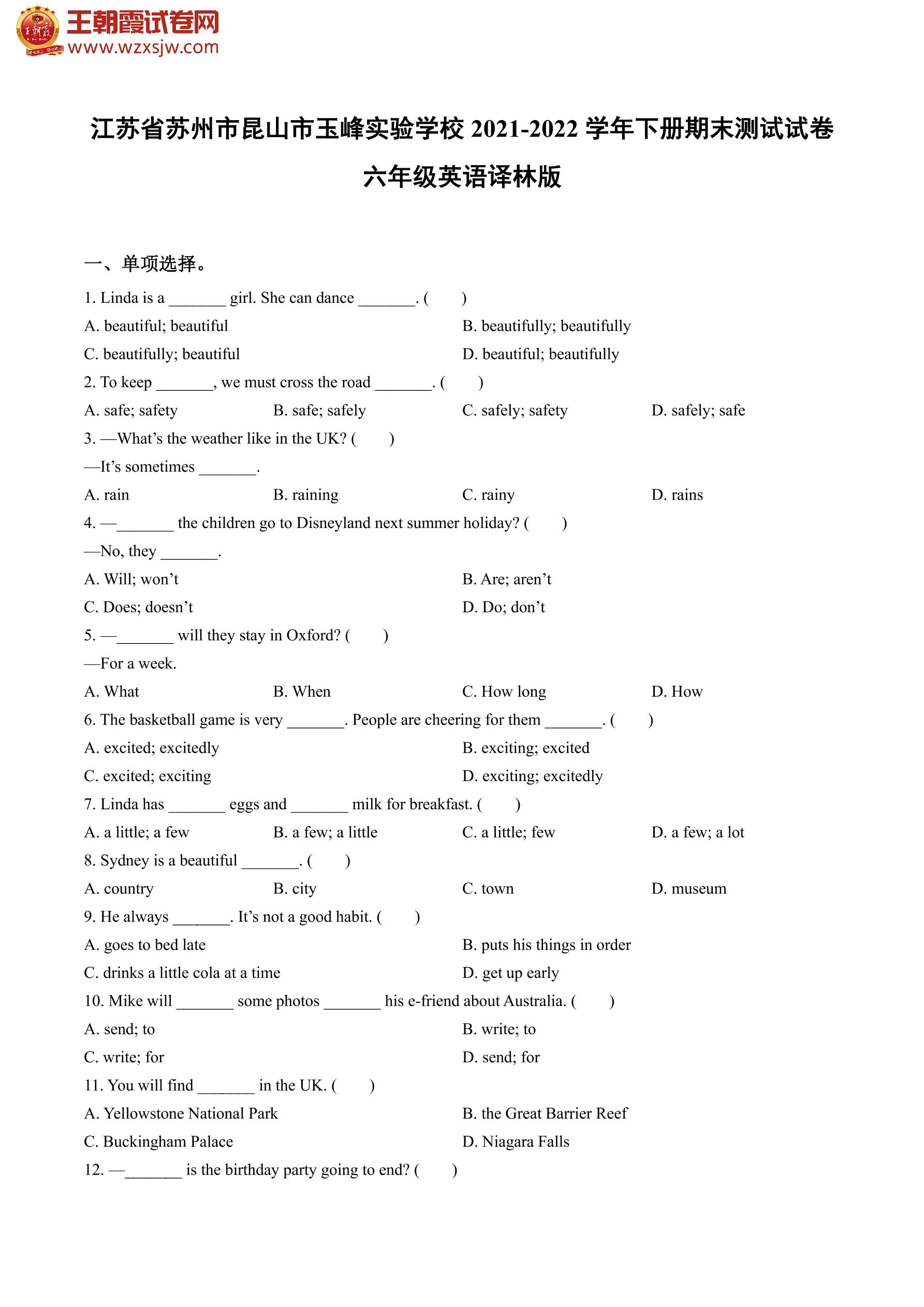 江苏省苏州市昆山市玉峰实验学校2021-2022学年下册期末测试试卷六年级英语(译林版)【无听力音频】