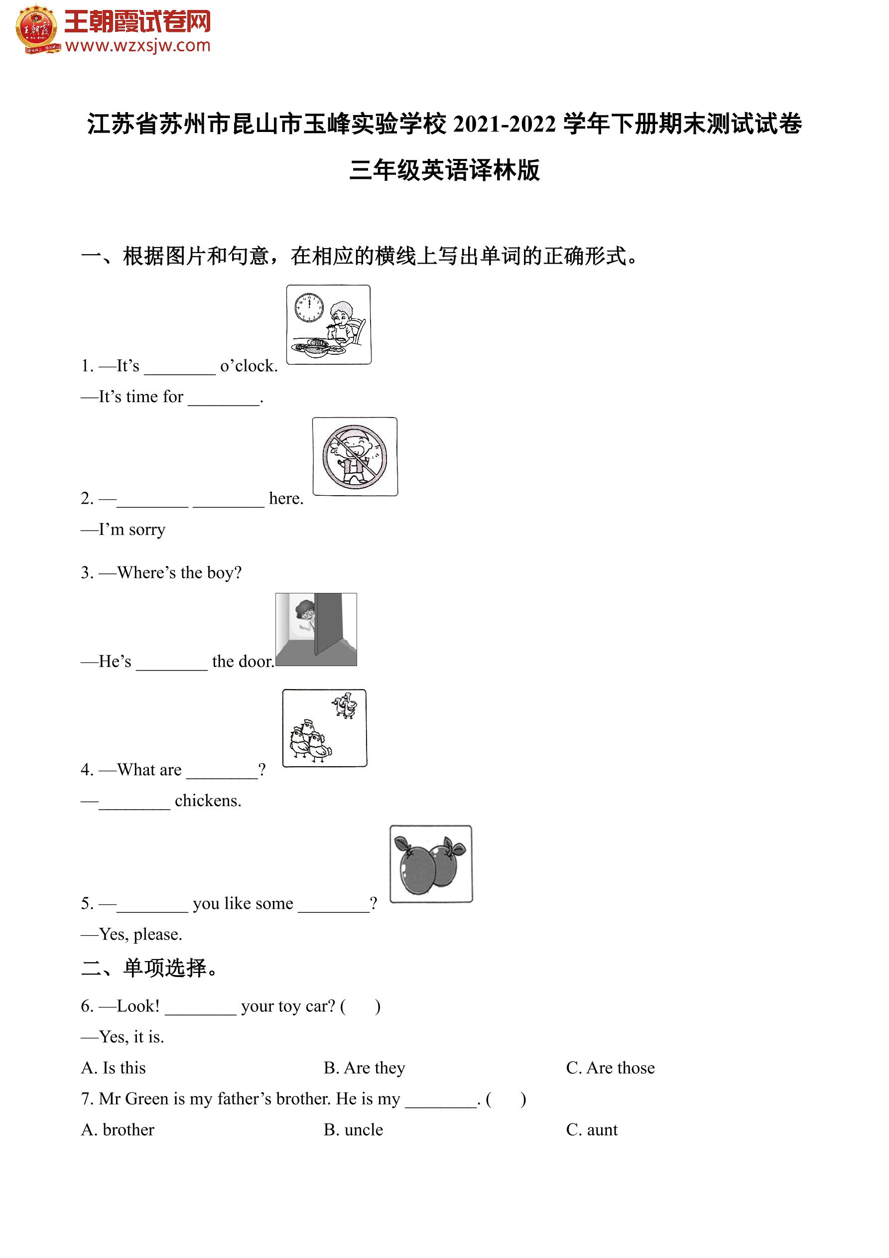 江苏省苏州市昆山市玉峰实验学校2021-2022学年下册期末测试试卷三年级英语(译林版)【无听力音频】
