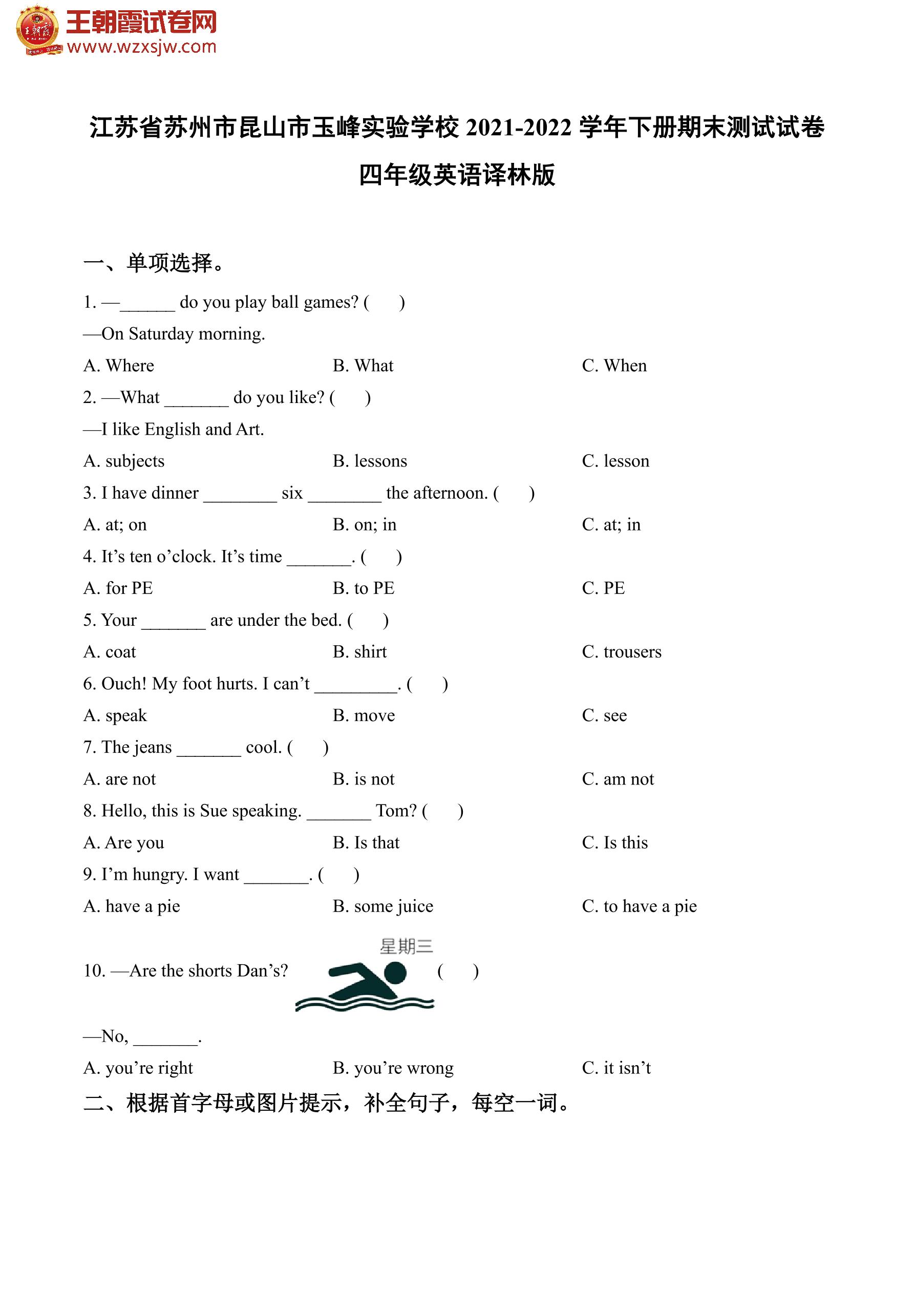 江苏省苏州市昆山市玉峰实验学校2021-2022学年下册期末测试试卷四年级英语(译林版)【无听力音频】