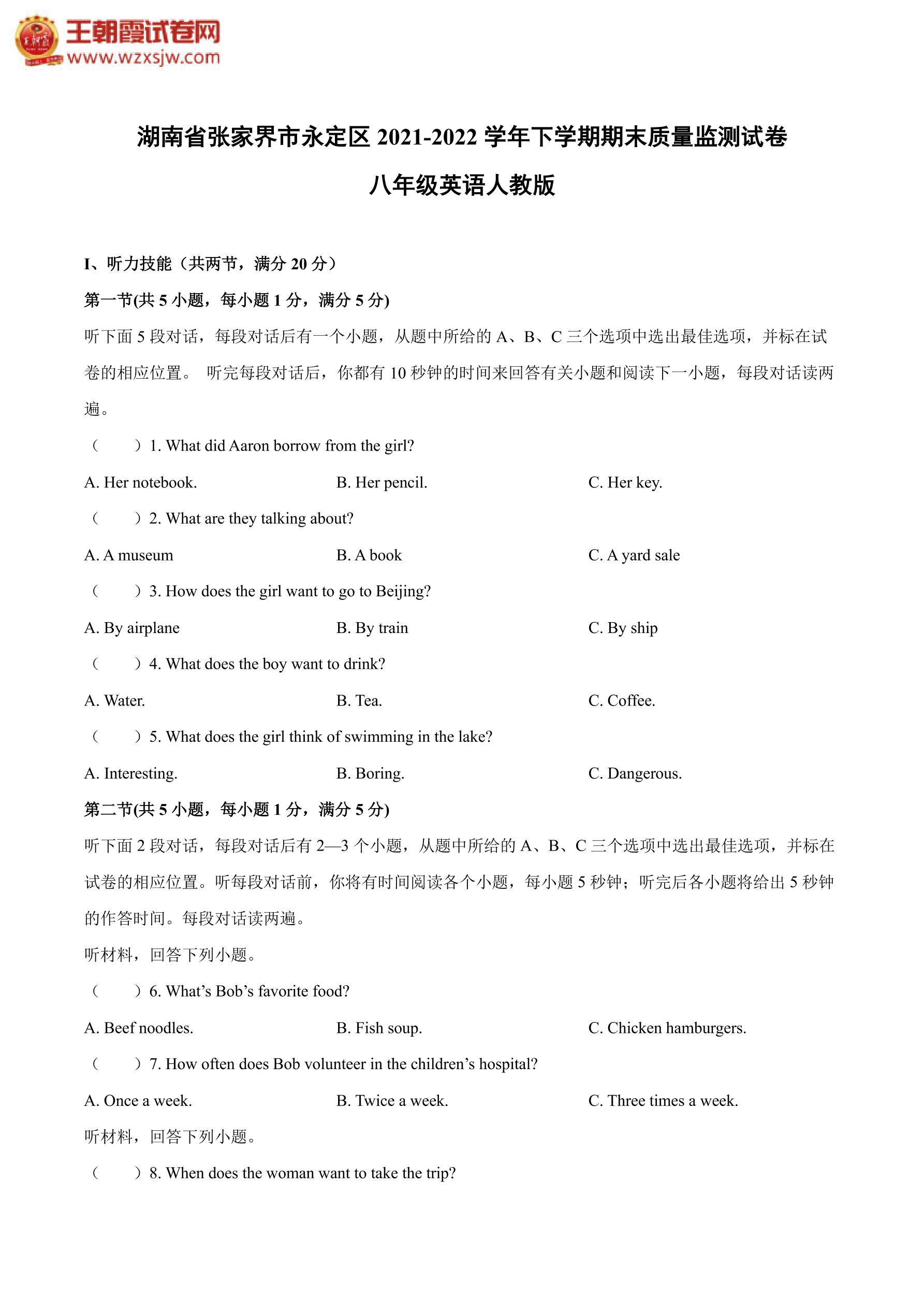 湖南省张家界市永定区2021-2022学年下学期期末质量监测试卷八年级英语(人教版)【无听力音频】