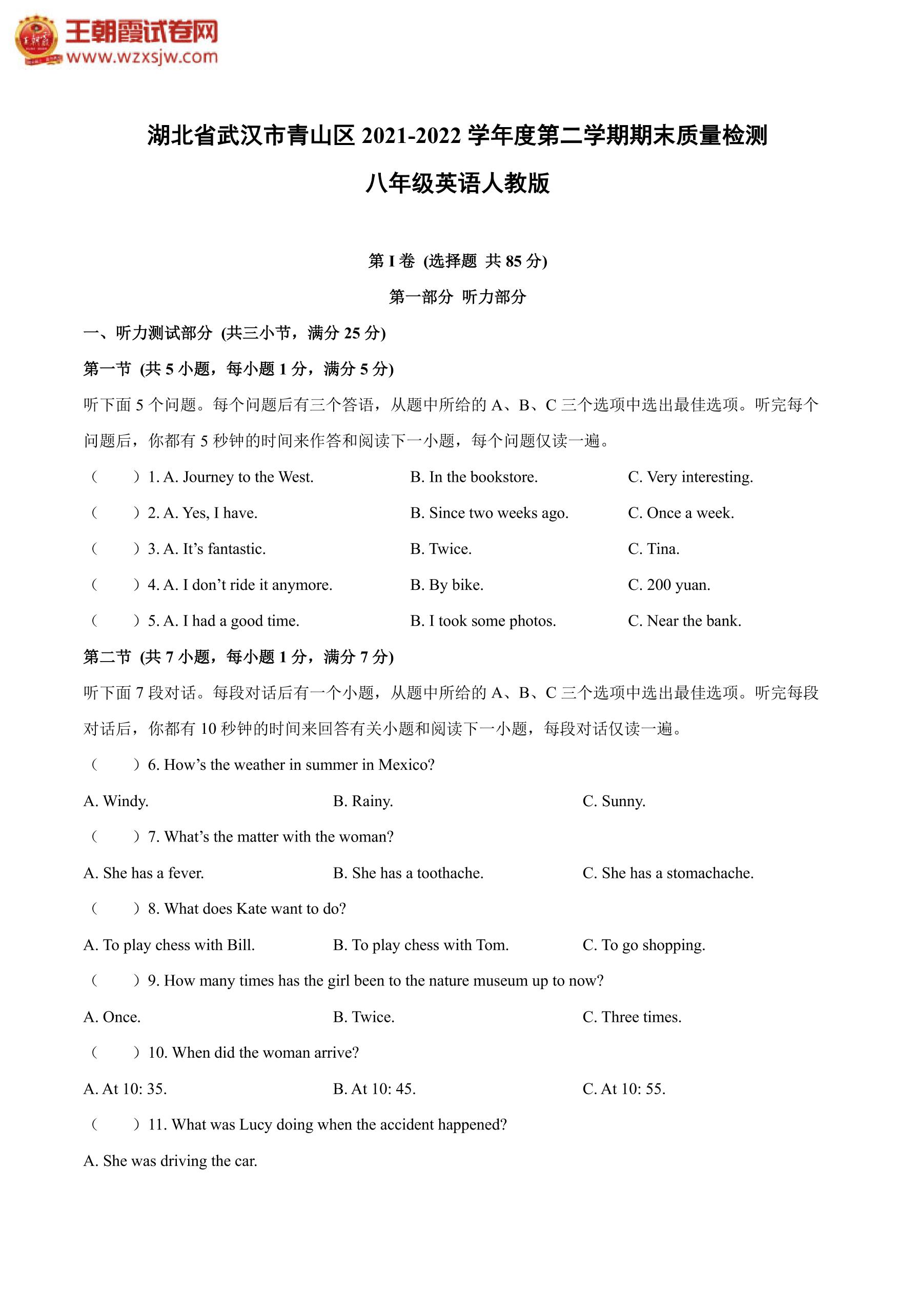 湖北省武汉市青山区2021-2022学年度第二学期期末质量检测八年级英语(人教版)【无听力音频】