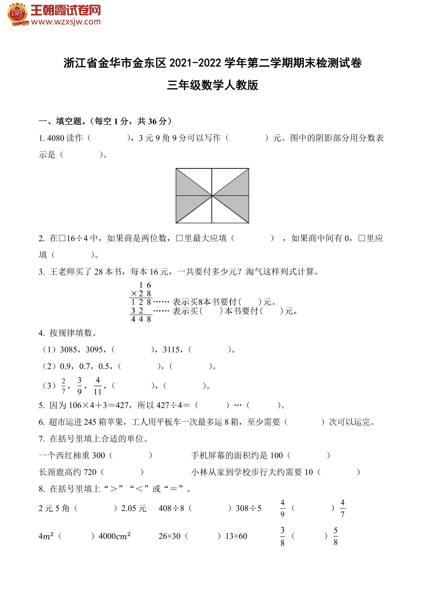 浙江省金华市金东区2021-2022学年第二学期期末检测试卷三年级数学(人教版)