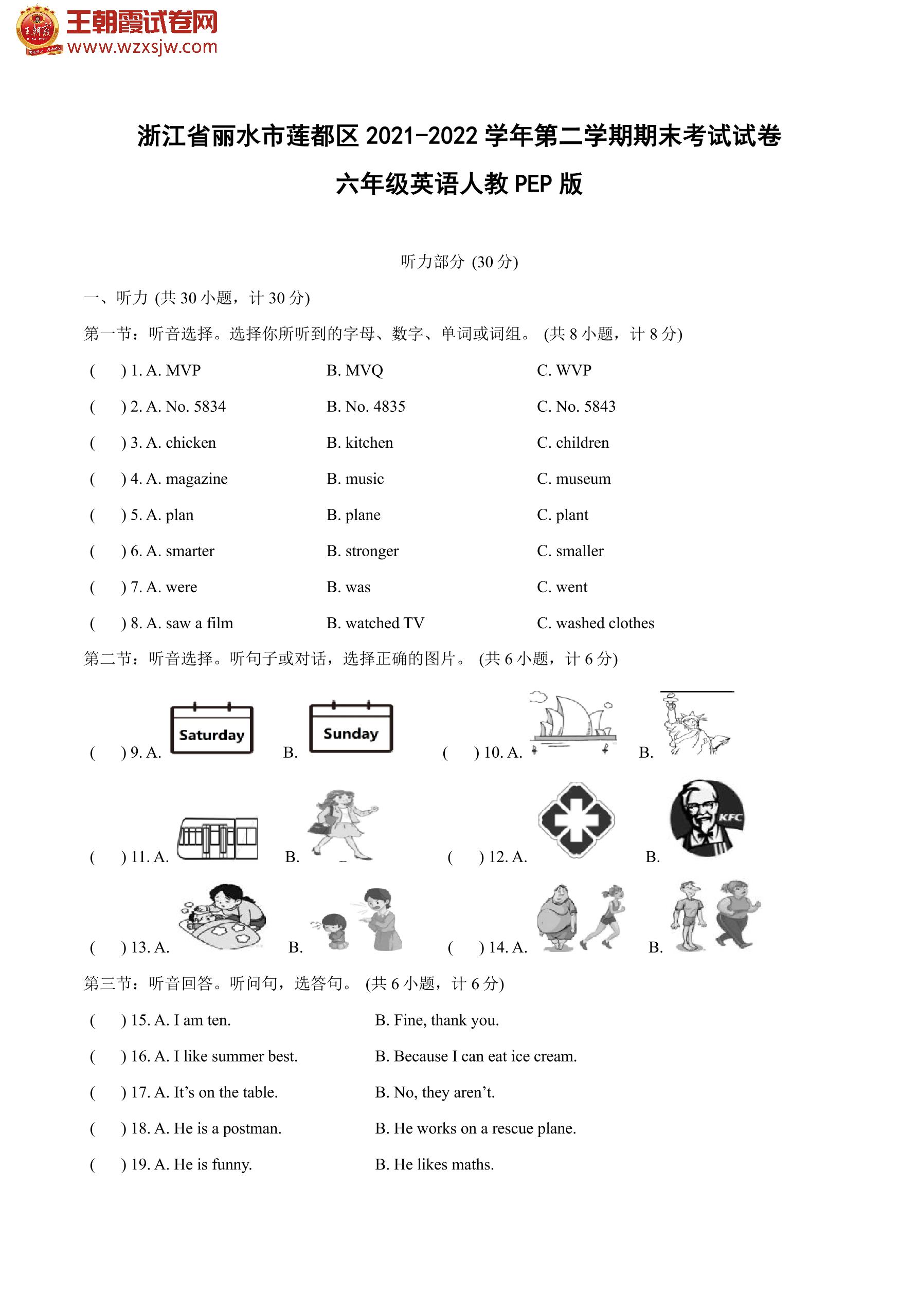 浙江省丽水市莲都区2021-2022学年第二学期期末考试试卷六年级英语(人教PEP版)【无听力音频】